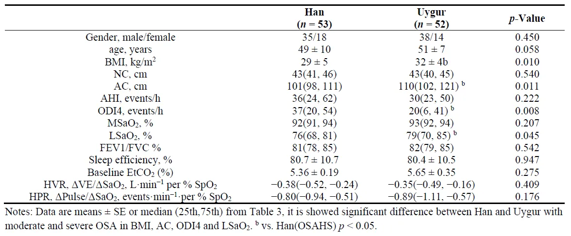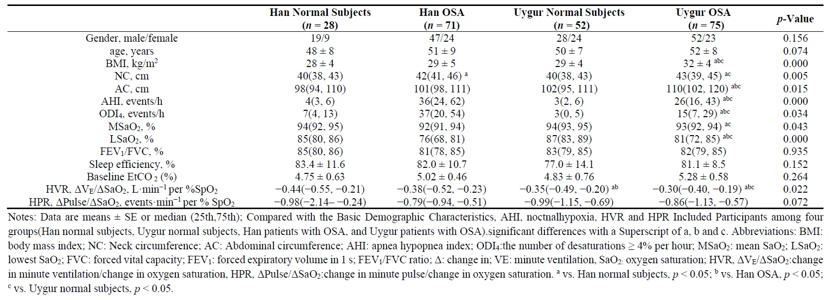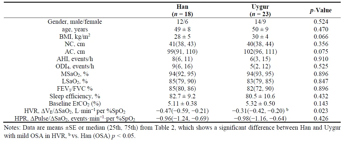 The HVR and HPR of patients with OSA and normal subjects were compared. It was found that there was a decrease in HVR in Uygur individuals with OSA and Uygur individuals without OSA compared to Han individuals with OSA and Han individuals without OSA, respectively (