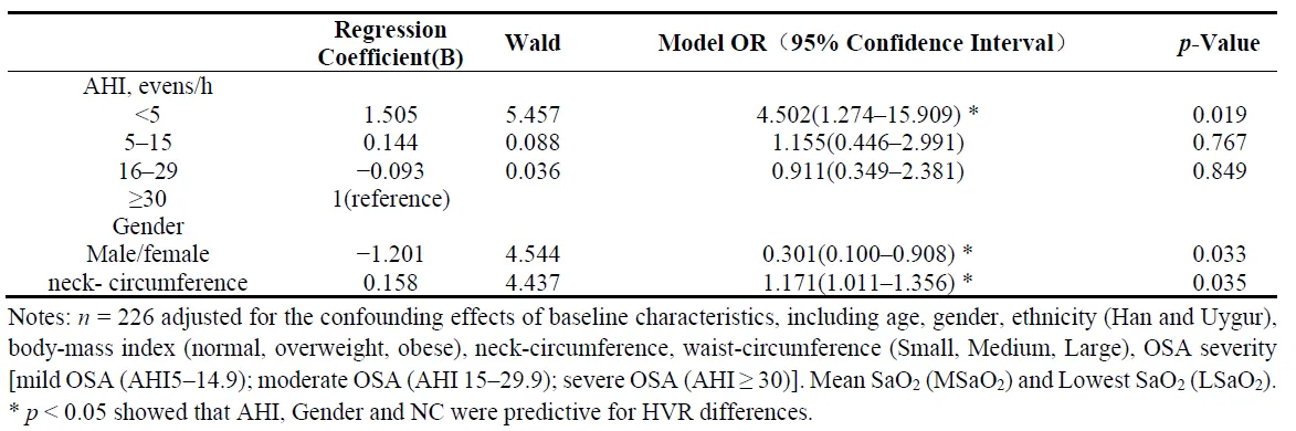 presents the results of multiple logistic regression analyses performed on HVR as a binary outcome using normal and abnormal reference values. The cut-off points for abnormal outcomes were defined as values below <−0.56 and above >−0.14. The normal reference value was determined to be −0.35 ± 0.21. The 95% two-sided reference value range was calculated as x ± 1.96 SD. This analysis aimed to identify independent predictors, employing forward stepwise methods with Wald Chi-square statistical tests. Ten predictors were initially entered into the model using the stepwise technique. Eventually, only AHI, sex, and NC remained in the final model, indicating that OSA severity, sex, and neck circumference were predictors of HVR.