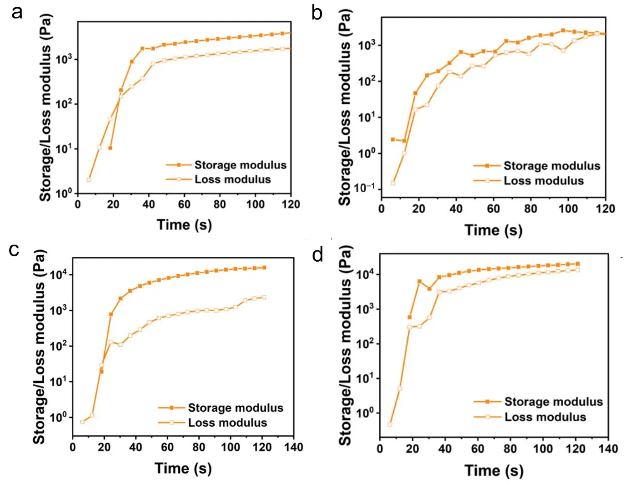 G”). As the reaction time extends, the inks gradually underwent gelation, resulting in