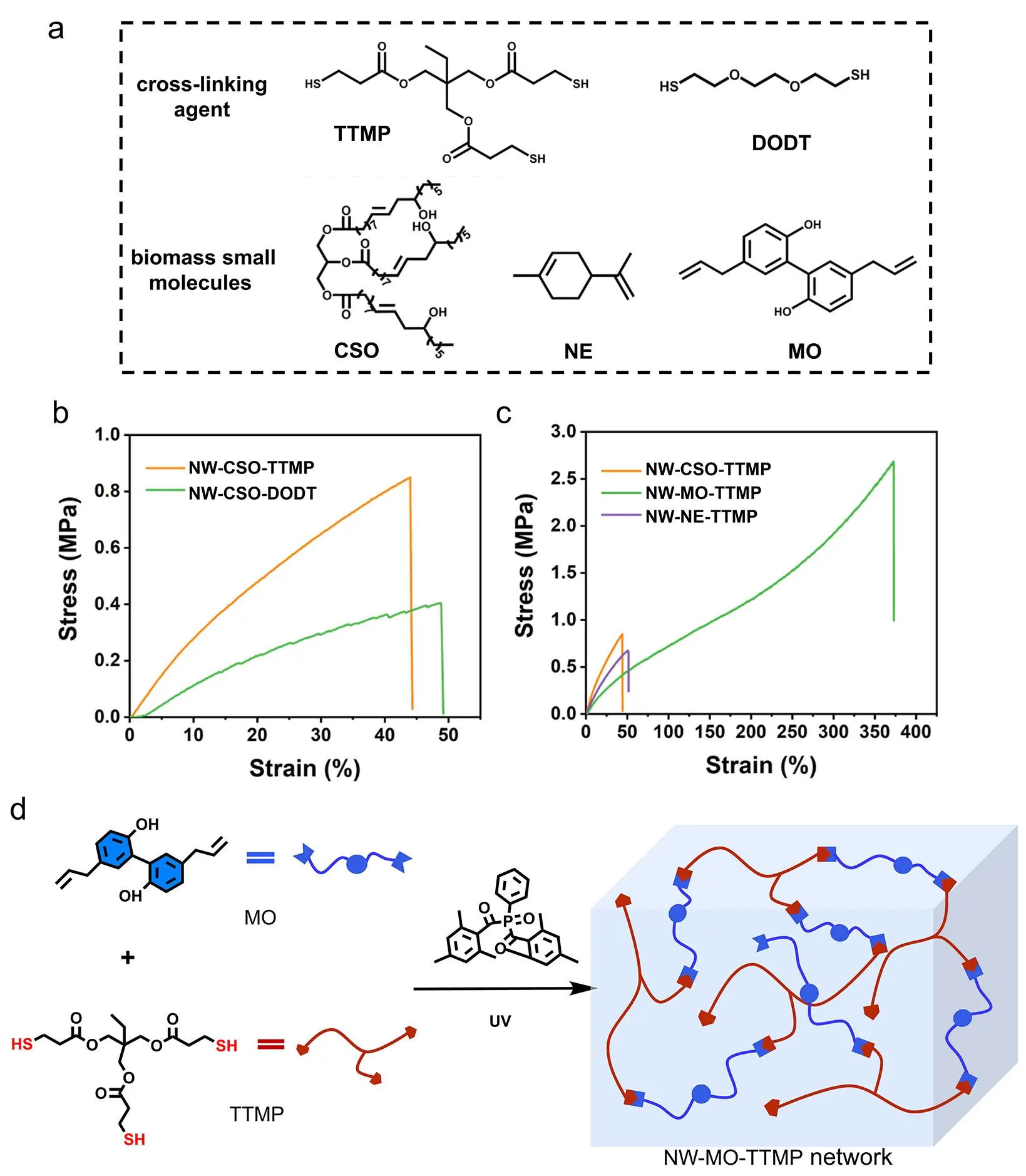 Figure 1. (<b>a</b>) Chemical structure of cross-linking agent and biomass-derived small molecules; Stress-strain curves of elastomers with different crosslinkers (<b>b</b>) and different biomass-derived small molecules (<b>c</b>); (<b>d</b>) reaction diagram of NW-MO-TTMP cross-linked network.