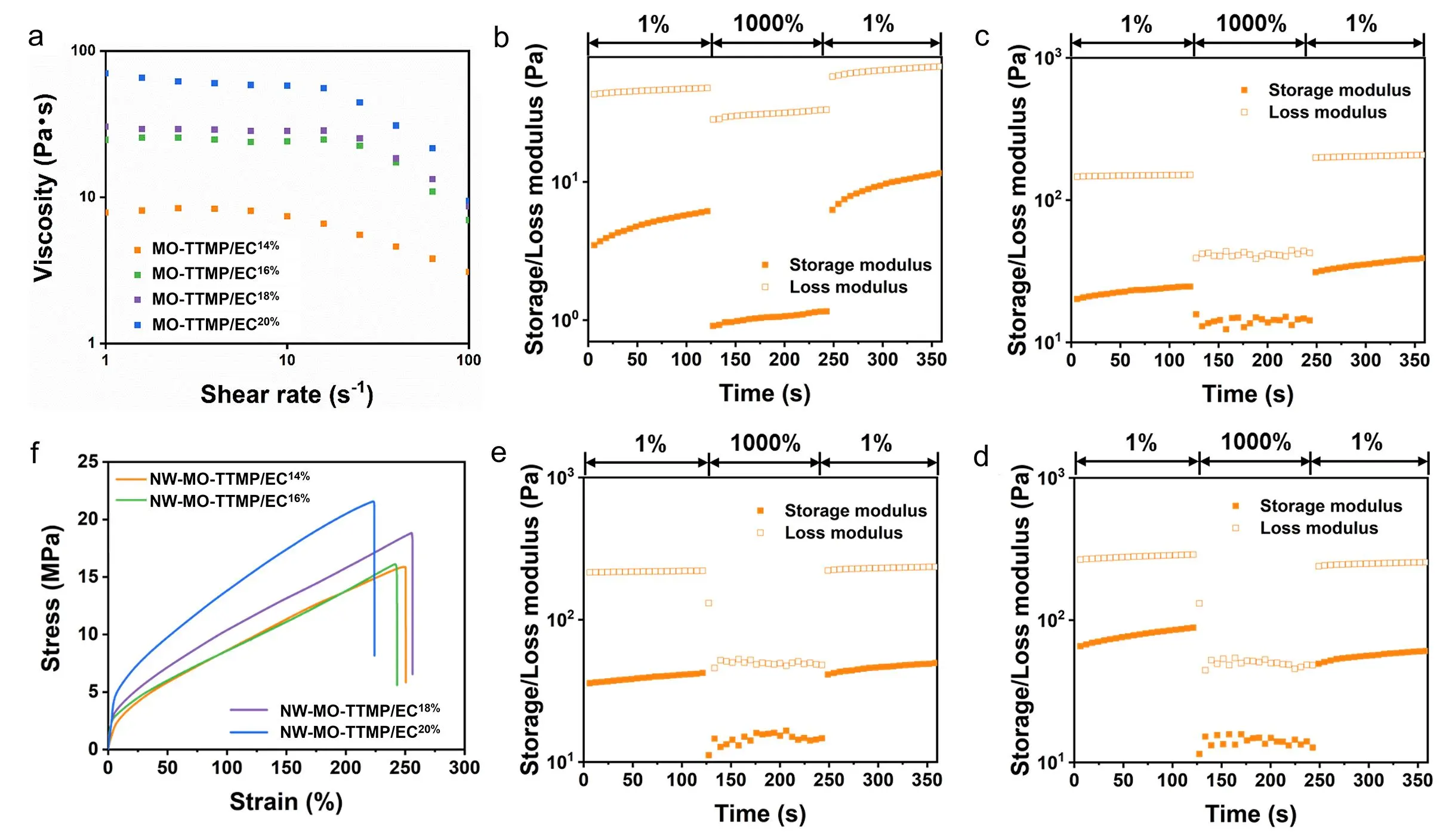 wEC was evaluated by analyzing their modulus in cyclic strains at 1% and 1000% (b–e). A 1% strain represents the state of the ink in the cylinder without external force, while a 1000% strain simulates external extrusion. The increase in