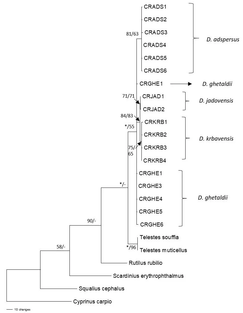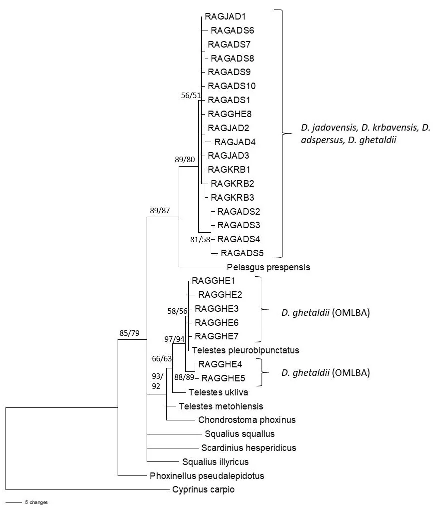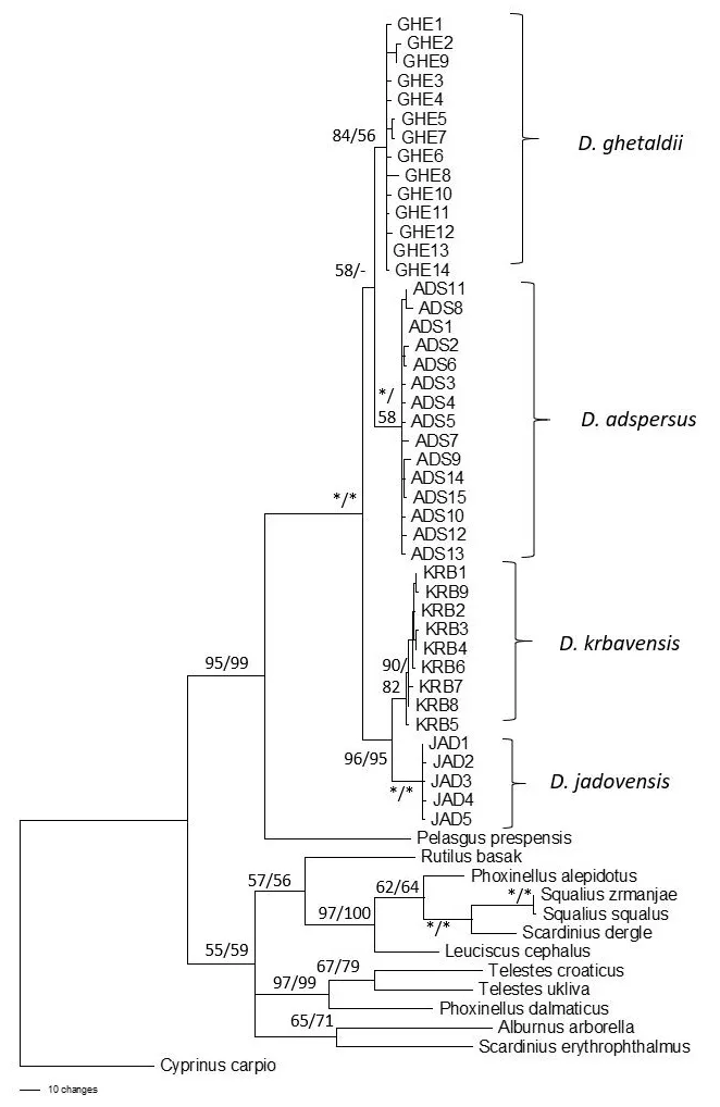 Cyprinus carpio were used as outgroups. Namely, since in the analyses we have also included representatives of other Leuciscidae species, the rooting could be accomplished by a species that is outside Leuciscidae family, but inside Cypriniformes and for which sequences of all investigated genetic markers are available, so
