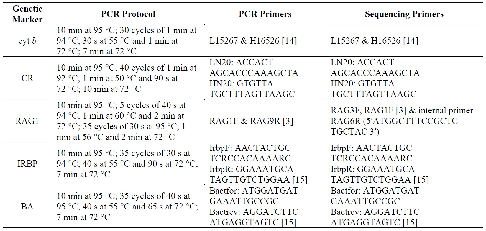 b) and control region (CR), and nuclear recombination activating gene 1 (RAG1), gene for interphotoreceptor retinoid binding protein (IRBP) and gene for beta-actin (BA). All but CR are protein coding genes and CR is a non-coding DNA with function in RNA and DNA synthesis.