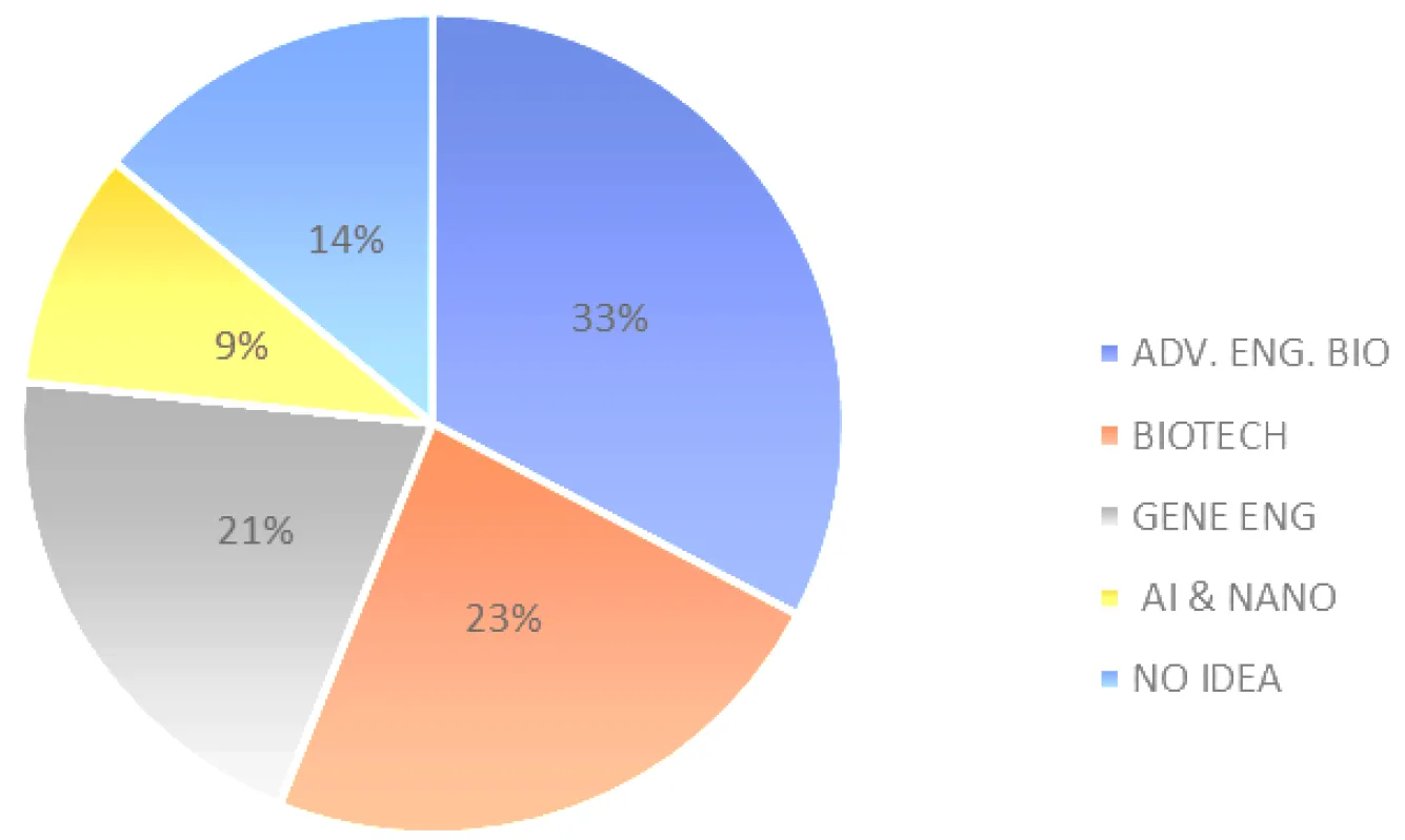 The varying definitions provided by respondents reflect this gap in knowledge. Most respondents defined synthetic biology within the context of biotechnology or genetic engineering (23% and 21%, respectively), which suggests a narrower understanding of the field. This is consistent with global trends, where synthetic biology is often viewed as an extension of biotechnology due to its overlap with genetic engineering. A smaller fraction (14%) recognized synthetic biology as advanced engineering biology, while 9% linked it with artificial intelligence or nanotechnology, highlighting the multidisciplinary nature of the field.
