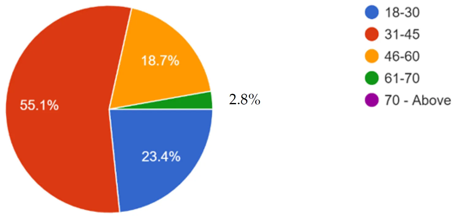 The survey study received a total of one hundred and seven (107) responses, with almost balanced gender groups: 48.6% females and 51.4% males (). The age distribution of respondents showed that 55.1% were between 31–45 years old, 23.4% between 18–30 years, 18.7% between 46–60 years, 2.8% between 60–70 years, and 0% between 70-above (). Regarding geographical distribution, the responses were from all six geopolitical zones of Nigeria. The South-South zone accounted for 28% of respondents, followed by the North-Central and North-East zones (16.8% each), North-West (15.9%), South-East (12.1%), and South-West (10.31%) ().