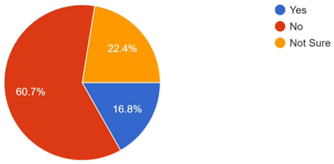 Regarding the awareness of existing regulatory agencies, 16.8% of respondents believed there is an institution mandated to regulate synthetic biology (See ). Among those who identified such an agency, 57% mentioned the National Biosafety Management Agency (NBMA) as the primary regulatory body (See ). Other institutions mentioned include Bayero University Kano (10%), Ahmadu Bello University (9%), the National Agency for Food and Drug Administration and Control (NAFDAC) (9%), and smaller percentages for organizations such as the Standards Organization of Nigeria (SON), National Biotechnology Development Agency (NABDA), and the Nigeria Centre for Disease Control (NCDC).
