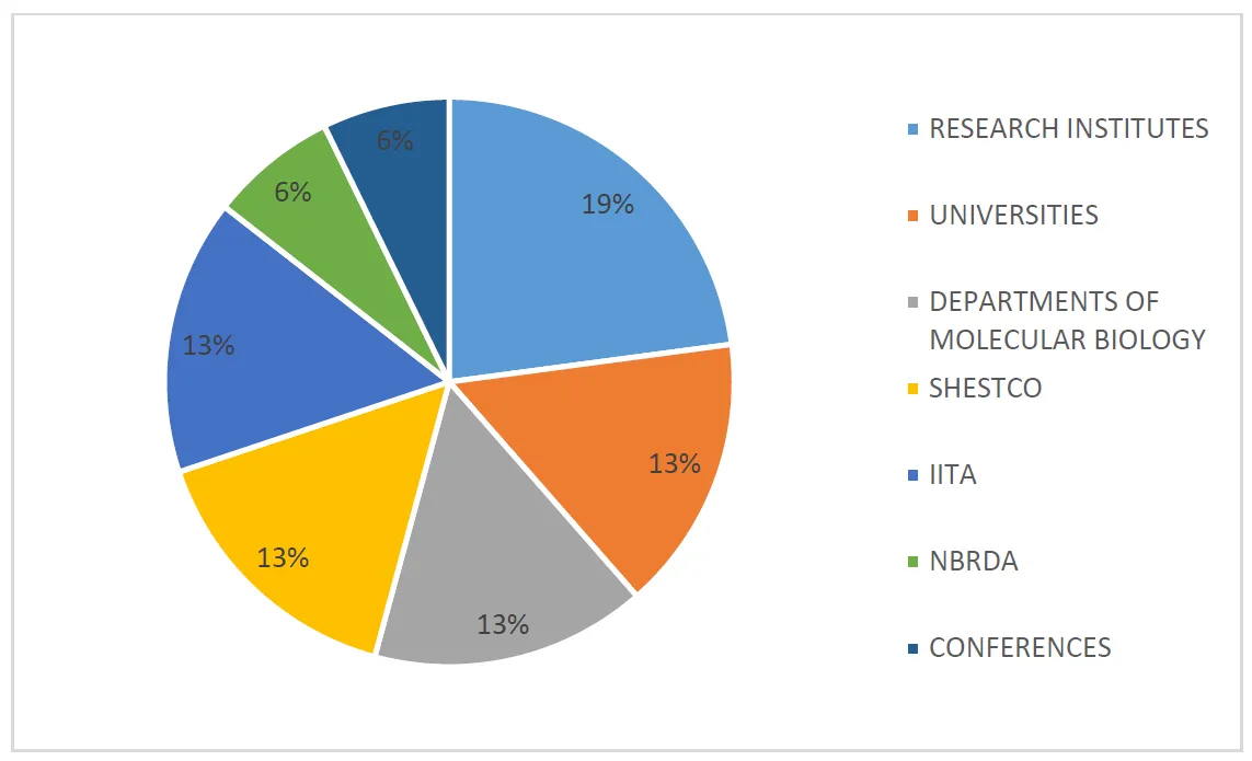 The survey responses revealed a significant lack of awareness regarding institutions that provide training in synthetic biology. Only 13.1% of respondents indicated knowledge of such institutions, while a substantial 86.9% reported being unaware of any training institutions (See ). When asked to identify specific institutions, 19% of respondents named research institutes as the main providers of synthetic biology training, 13% pointed to universities and their departments of molecular biology, and another 13% cited organizations such as the International Institute of Tropical Agriculture (IITA), Ibadan Nigeria, and the Sheda Science and Technology Complex (SHESTCO), Abuja Nigeria. Additionally, 6% of respondents mentioned conferences as venues for synthetic biology training ().
