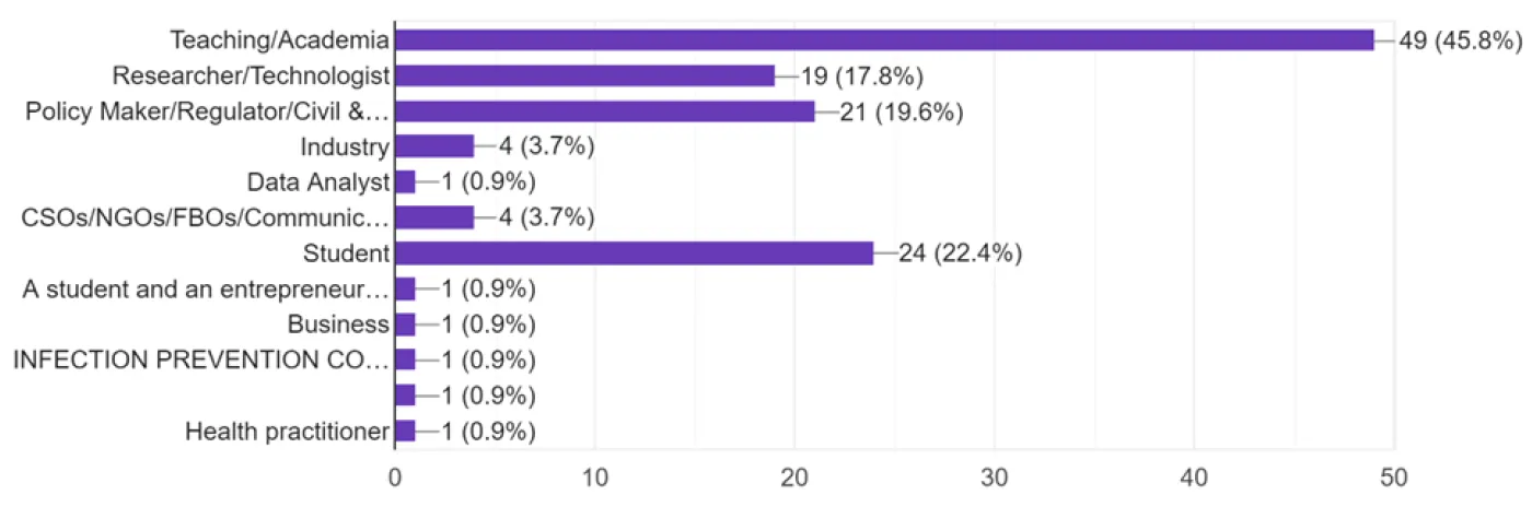 The professional background of respondents was diverse, with 45.8% in academia, 22.4% being students, 19.6% in policy-making/government institutions, and 17.8% from research institutions (). Additionally, 3.7% of respondents worked in industry and non-governmental organizations (NGOs), while the remaining participants were health practitioners, entrepreneurs, business people, and others.