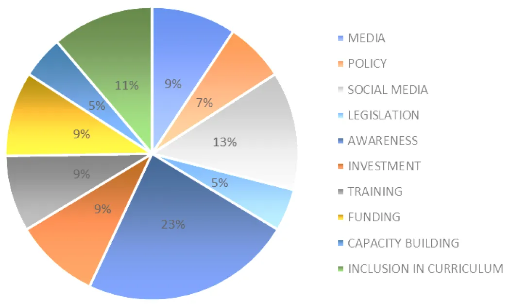The survey responses revealed various suggestions for advancing synthetic biology in Nigeria. According to the data (See ), 23% of respondents believe that increasing awareness about synthetic biology is the most critical factor for its improvement. Another 13% of respondents suggested that engagement through social media platforms would enhance visibility and attract a broader audience. Additionally, 11% emphasized the importance of incorporating synthetic biology into educational curricula, while 9% highlighted the need for funding, investment, capacity building, and legislation as key to advancement. Policy improvements were suggested by 7% of respondents, and 5% mentioned the role of traditional media and specialized training programs in advancing synthetic biology in Nigeria.
