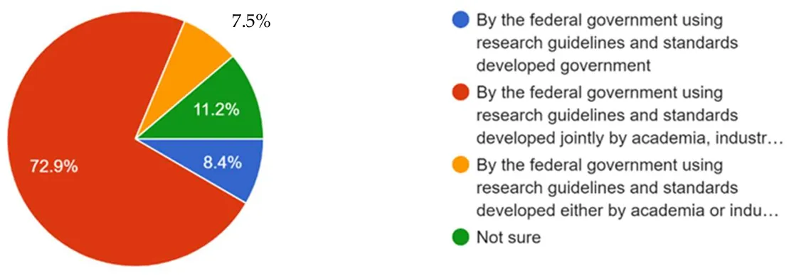 When asked who should regulate synthetic biology, 72.9% of respondents believed that the Federal Government, in collaboration with academia and industry, should develop the regulatory framework (See ). Additionally, 8.4% favored a government-led approach, while 7.5% suggested that industry or academia should take the lead in developing the guidelines, with the government overseeing their implementation. The remaining 11.2% were uncertain about the best regulatory approach.