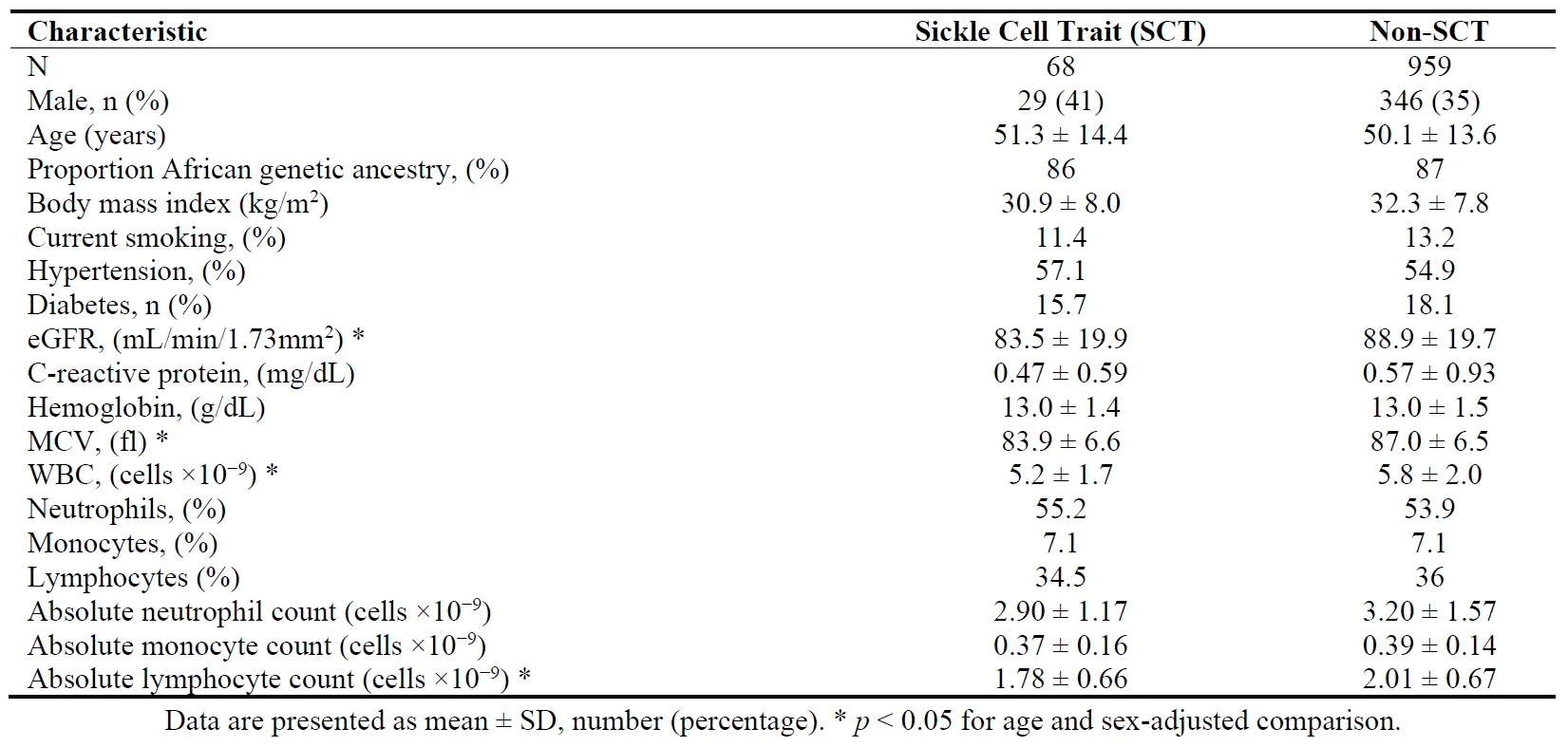 Among the 1027 participants included in the study, 48% were female and the average age was 62 years (range 40 to 88 years). There were 68 with SCT and 959 Black participants without SCT. The baseline characteristics of the participants are shown in , stratified by SCT status. Compared to Black individuals without SCT (Hb A/A), those with SCT (HbA/S) had lower age- and sex-adjusted estimated glomerular filtration rate (eGFR), MCV, total white blood cell (WBC) count, and total lymphocyte count (all
