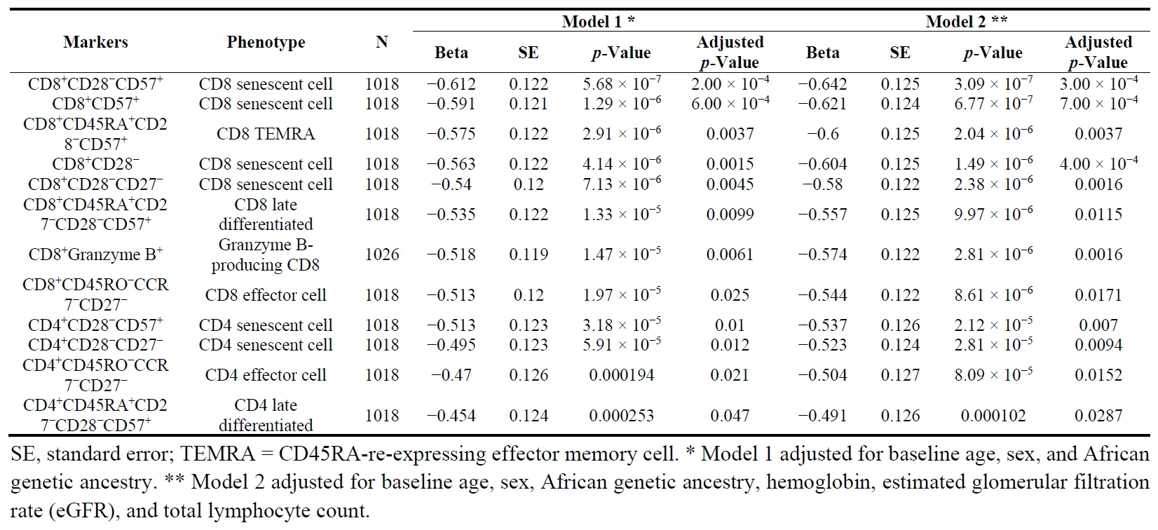 In age-, sex-, and genetic ancestry-adjusted linear regression models, SCT was significantly associated with lower proportions of CD8