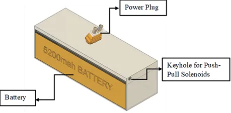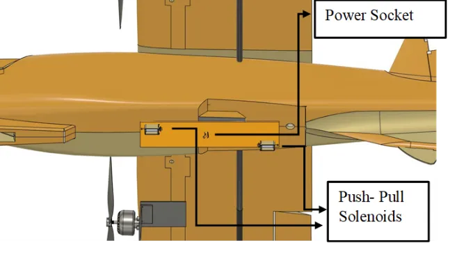 The battery used for our hybrid VTOL is a 5200 mah lithium polymer battery. The Battery is enclosed in a 3D-printed casing designed and used for easy installation and removal (See ). The connector is rigidly fixed and exposed out of the casing, ensuring secure battery retention, and facilitating smooth swapping maneuvers. The casing also has diagonally opposite extruded cuts for precise alignment. The payload is placed right under the wings at the center of gravity (CG) position of the Hybrid VTOL aircraft, ensuring stability.