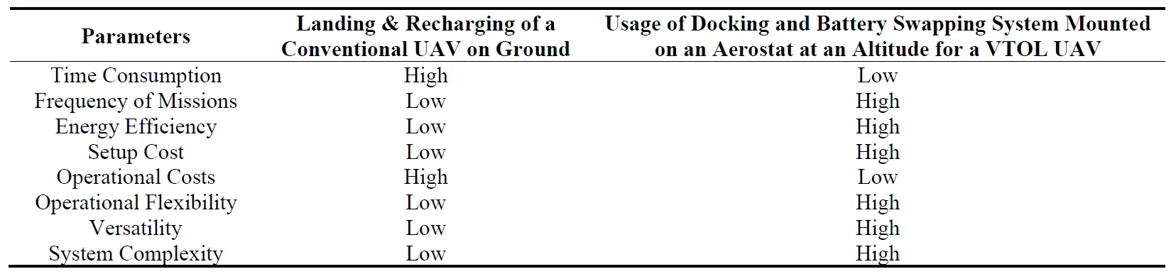 shows a comparative analysis of a conventional UAV landing and recharging method and the usage of docking and battery swapping systems mounted on an aerostat at an altitude for a hybrid UAV. Initial setup costs can be quite high for the latter, but on a larger scale, the operating costs can be cut down to a larger scale. Other parameters like time consumption, energy efficiency, and frequency of missions, which are paramount in the industry, all benefitd from such a technology.