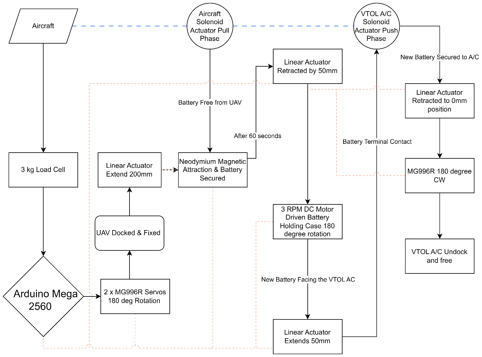 The electronic circuit for the docking and battery swapping system (See ) consists of a 3kg Load Cell to detect and convert the Mechanical Load into Digital Pulses. This is then connected to the HX711 Amplifier, which amplifies the incoming signal from the load cell and sends it to the Microprocessor for further action. Arduino Mega 2560 was chosen as the microprocessor due to its simplicity in programming, flexibility, and redundancy. A 3 RPM Direct Current Motor is connected to the LN298 Motor Driver, which controls the speed and direction and regulates the amount of voltage to the motor. This is used in the Rotating battery Holder using the Microprocessor. Two MG996R Servo Motors which are High Torque, 360-degree rotation are for the clamping mechanism of the Docking system, which the Arduino Mega controls. A 1000 mm Linear Actuator is connected to a relay in tandem for directional and speed control. All these components are controlled by the microprocessor, using appropriate programs. The sequenced control flow graph (see ) shows the detailed and timed process of the entire operation. This can also be called the Concept of Operations of the entire mission.