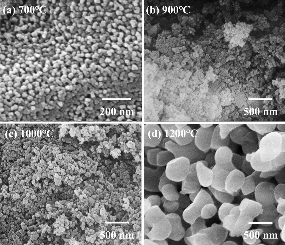 . Microstructure of light-burned MgO prepared at different temperatures: (<b>a</b>) 700 °C, (<b>b</b>) 900 °C, (<b>c</b>) 1000 °C, (<b>d</b>) 1200 °C.