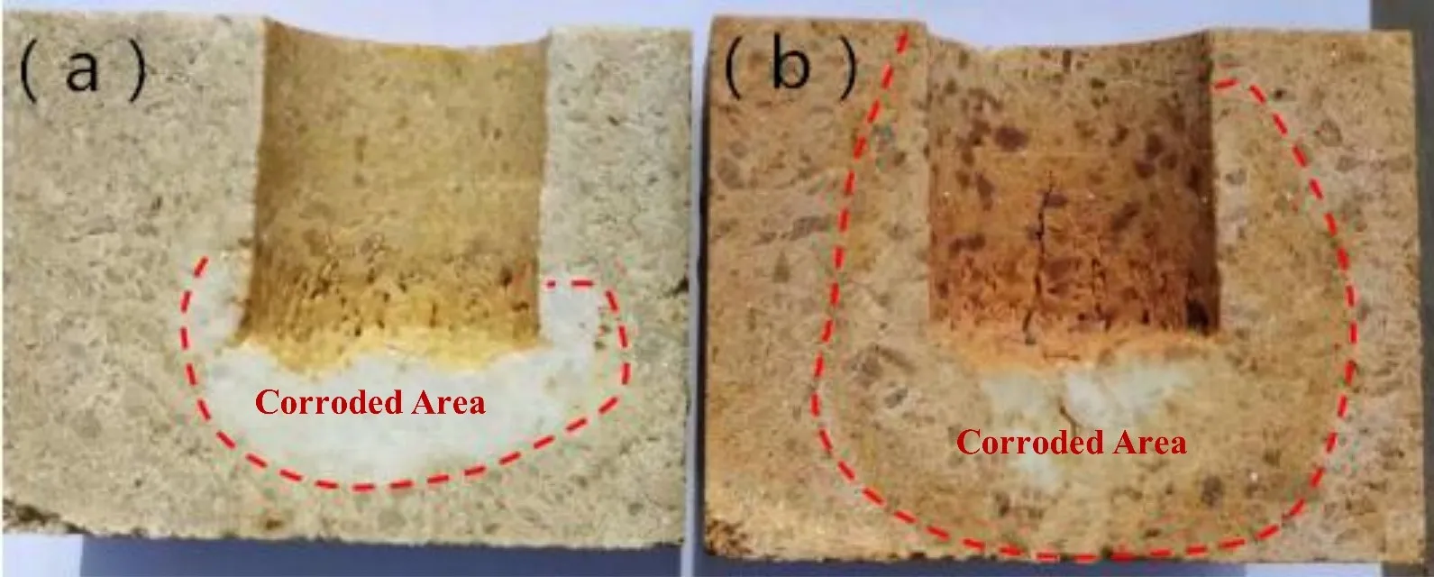 . Comparative photographs of slag resistance test of two types of square magnesite bricks: (<b>a</b>) high purity magnesite bricks prepared from sintered magnesia produced from microcrystalline magnesite ore in Tibet, and (<b>b</b>) ordinary 98 magnesite brick.