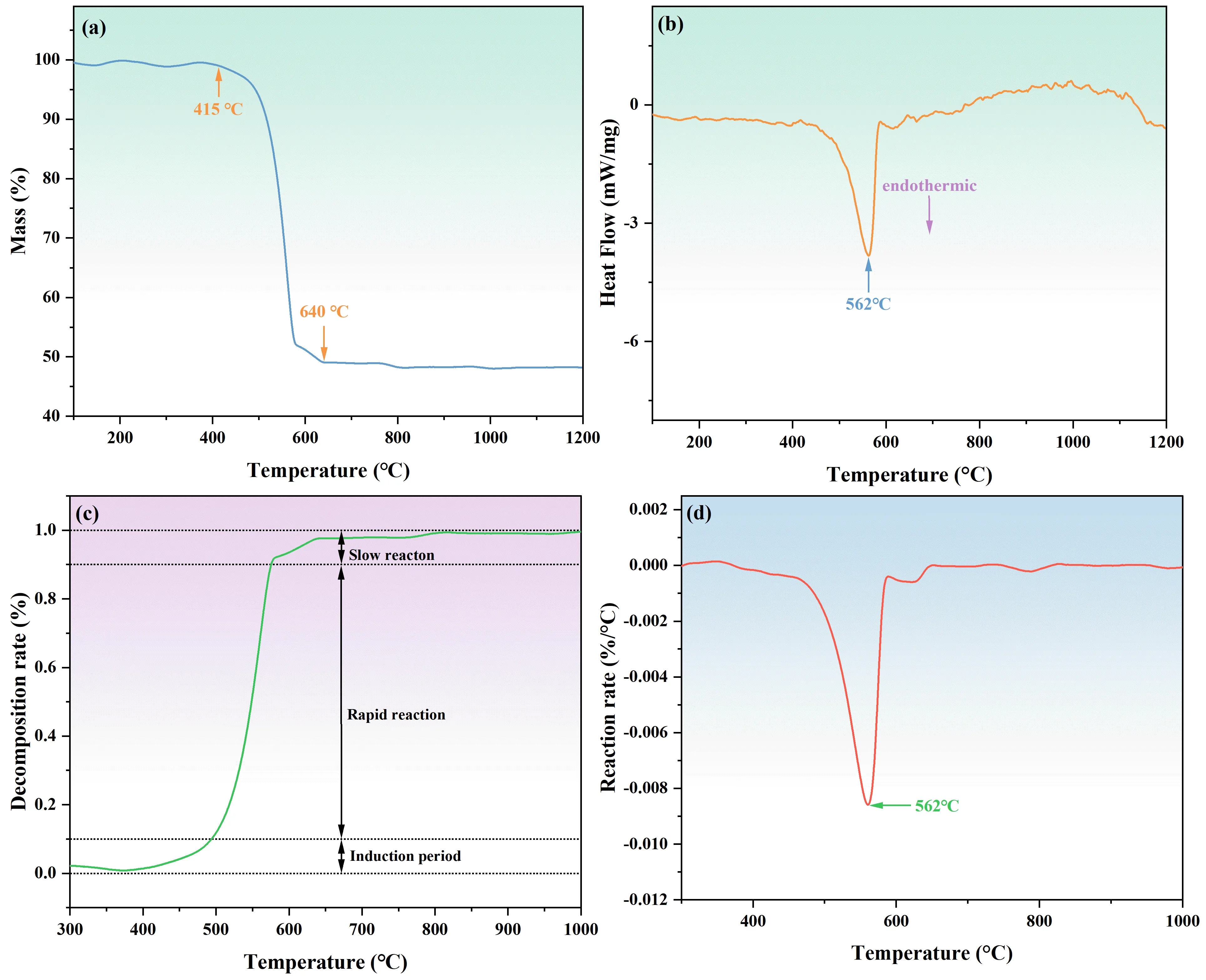 α, and (d) is the thermal decomposition rate. a, shows that the mass loss of microcrystalline magnesite is most significant in the temperature range of 450~600 °C. From the DSC curve in b, it can be seen that a strong heat absorption peak appeared at 562 °C, indicating that the decomposition reaction rate of microcrystalline magnesite was the largest at this temperature, which was consistent with the trend in d. With the increase in temperature, the microcrystalline magnesite was completely converted into magnesium oxide after 640 °C, and no mass loss was observed in the thermogravimetric curve. From c, it can be seen that the thermal decomposition curve of microcrystalline magnesite shows an “S” shape. The “S”-shaped decomposition curve can be divided into three reaction phases: (1) the induction period limited by heat transfer factors (0 <