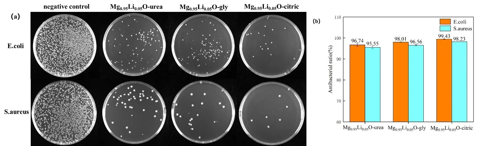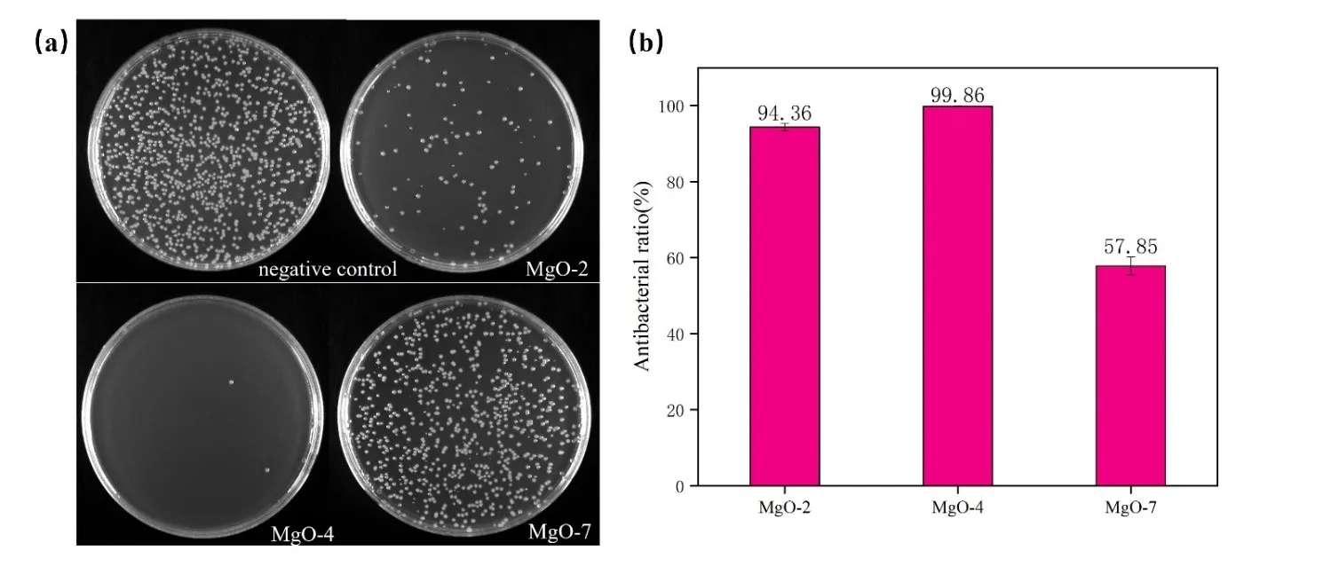 It was shown that using different fuels (e.g., citric acid, glycine, urea) and process parameters (e.g., roasting temperature, holding time) can significantly affect the microstructure and antibacterial properties of Nano-magnesium oxide. The results of antimicrobial experiments showed that the nanomagnesium oxide had good antimicrobial effects against Escherichia coli and Staphylococcus aureus, etc., especially the nanomagnesium oxide synthesized at precursor solution pH 4 showed the best antimicrobial properties. shows the colony counting experiments of the synthesized MgO nanoparticles under different precursor solution pH conditions, where Mg-2, Mg-4, and Mg-7 represent the pH of 2, 4, and 7, respectively. In addition, Li-ion doped MgO nanoparticles are further improved in antibacterial performance, showing higher zeta potential, lower electrochemical impedance, and more defects of the surface oxygen vacancies, and the results of antibacterial experiments and the mechanisms are shown in and , respectively.