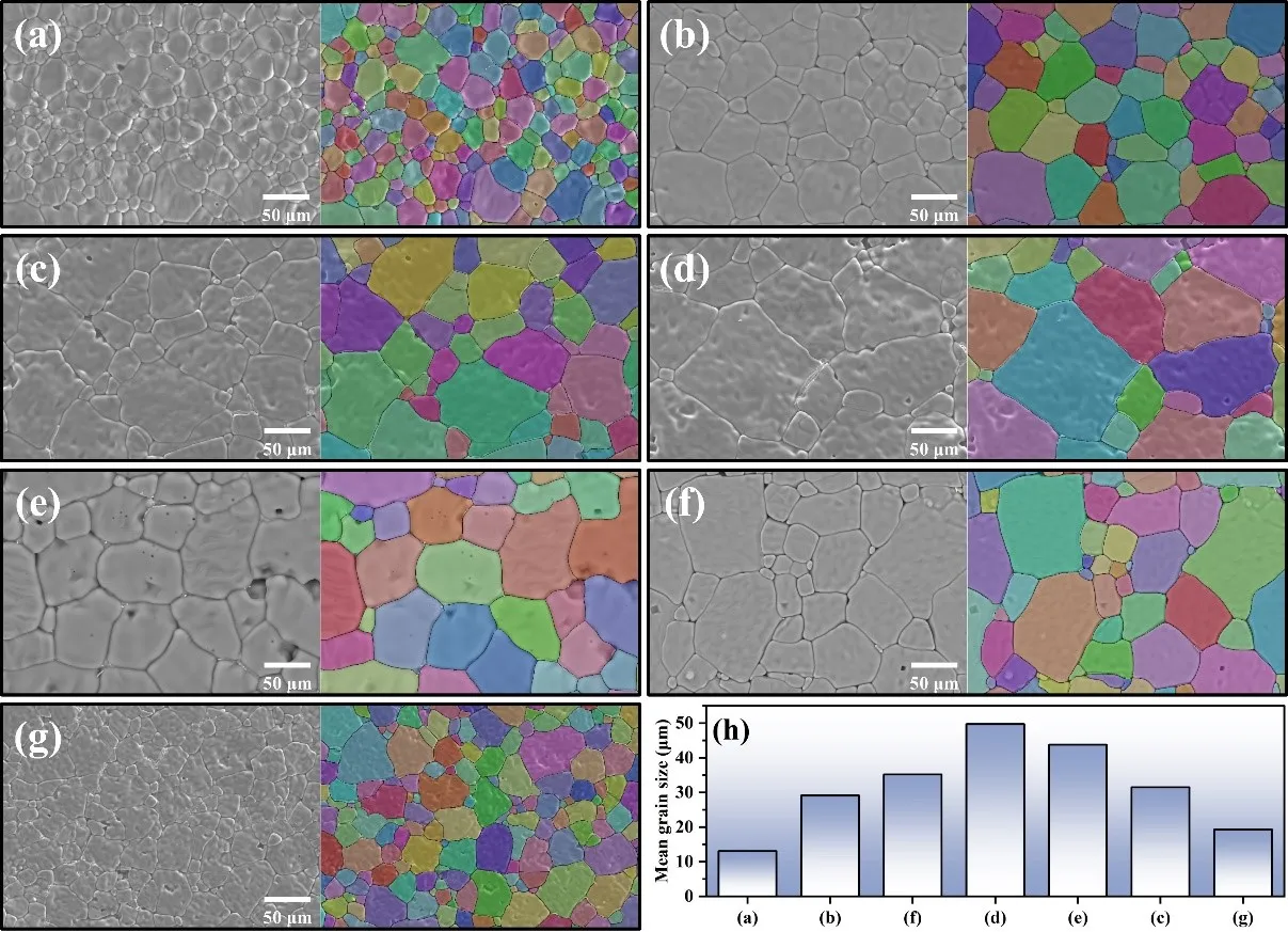 . Variation of grain size of sintered magnesias with different ZnO doping levels: (<b>a</b>) 0 mol%, (<b>b</b>) 1 mol%, (<b>c</b>) 2 mol%, (<b>d</b>) 4 mol%, (<b>e</b>) 6 mol%, (<b>f</b>) 8 mol%, (<b>g</b>) 10 mol%, (<b>h</b>) average grain size.
