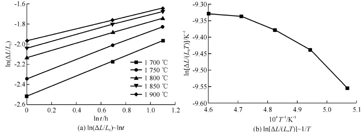 . Sintering kinetics curves for sintered magnesia: <i>L</i> is the original length of the specimen, and <i>L</i><sub>0</sub> is the length of the specimen after firing. ∆<i>L</i> = <i>L</i> − <i>L</i><sub>0</sub>, ∆<i>L</i> is the original length of the specimen, and <i>t</i> is the sintering time, and <i>T</i> is the sintering temperature.