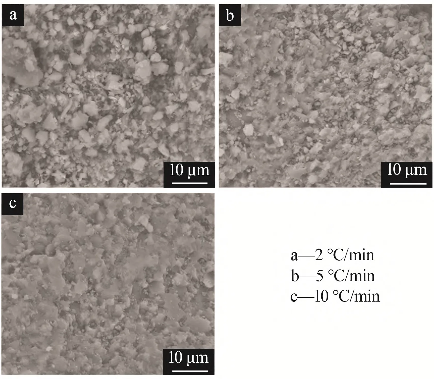 . Micro-morphology of Tibetan microcrystalline magnesite at 90% decomposition rate under different heating rate conditions.