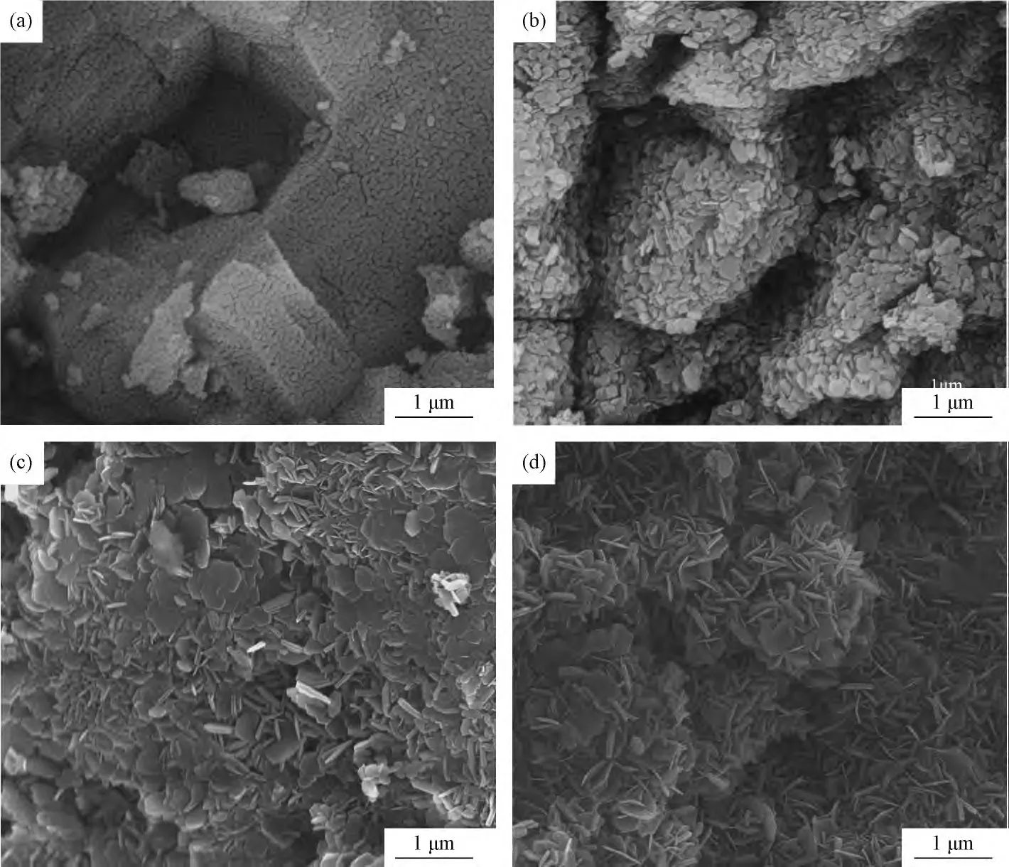 . SEM images of hydration products: (<b>a</b>) lightly fired MgO, (<b>b</b>) H<sub>2</sub>O, 25 °C, 30 min, (<b>c</b>) 5 wt%C<sub>4</sub>H<sub>6</sub>O<sub>4</sub>Mg-4H<sub>2</sub>O, 25 °C, 30 min, (<b>d</b>) 5 wt%C<sub>4</sub>H<sub>6</sub>O<sub>4</sub>Mg-4H<sub>2</sub>O, 25 °C, 60 min.