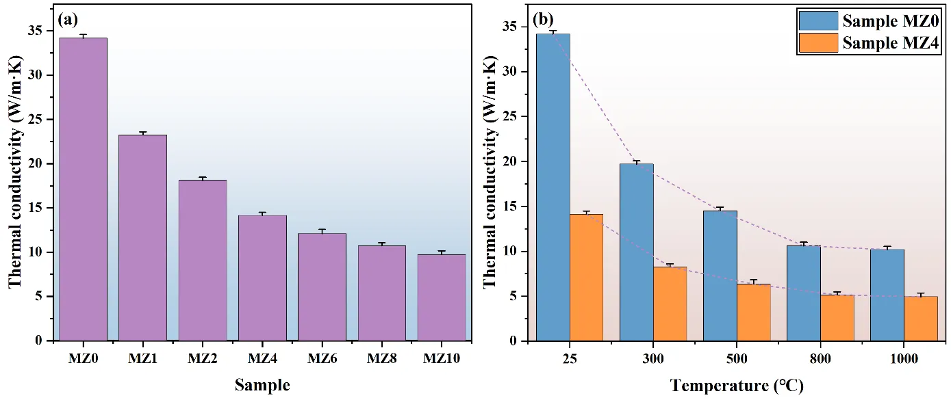 . Thermal conductivity of sintered magnesium oxide aggregate specimens with different ZnO dosages: (<b>a</b>) Normal temperature thermal conductivity of specimens with different ZnO dosages, (<b>b</b>) Thermal conductivity at different temperatures for MZ0 and MZ4 specimens.