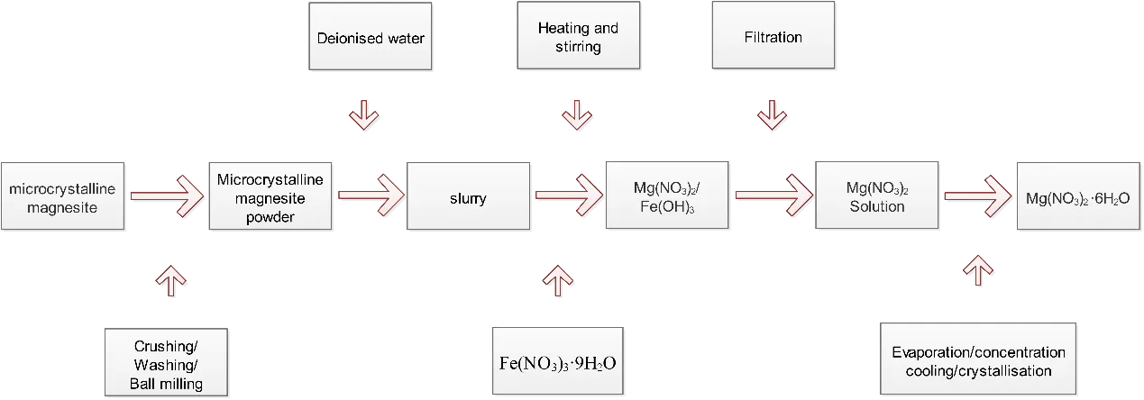 . Process flow diagram for the preparation of magnesium nitrate hexahydrate based on Tibetan microcrystalline magnesite.