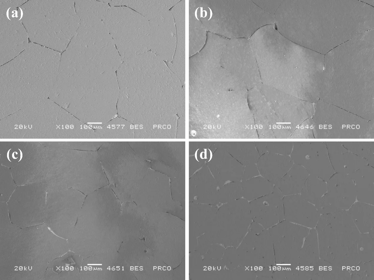 . SEM images of different grades of electrofusion products: (<b>a</b>) MgO content >99 wt%, (<b>b</b>) MgO content >98.5 wt%, (<b>c</b>) MgO content >98 wt%, (d) MgO content >97 wt%.