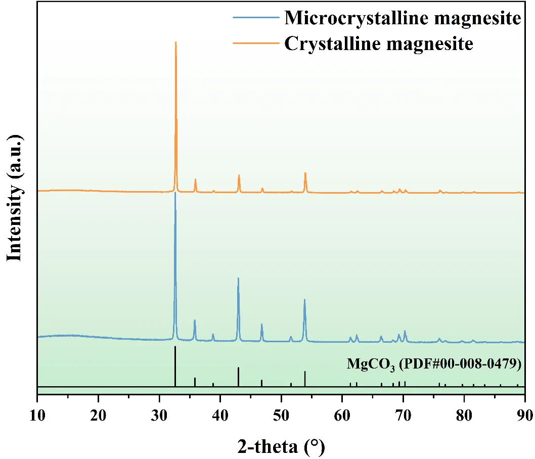 shows the typical chemical composition of Tibetan microcrystalline magnesite. and show the microstructure and XRD diagrams of Tibetan microcrystalline magnesite and Liaoning crystalline magnesite, respectively. It can be seen that the Tibetan microcrystalline magnesite is of high purity and has a micrometre crystalline size (2~4 μm). The main physical phase composition of Tibetan microcrystalline magnesite is MgCO