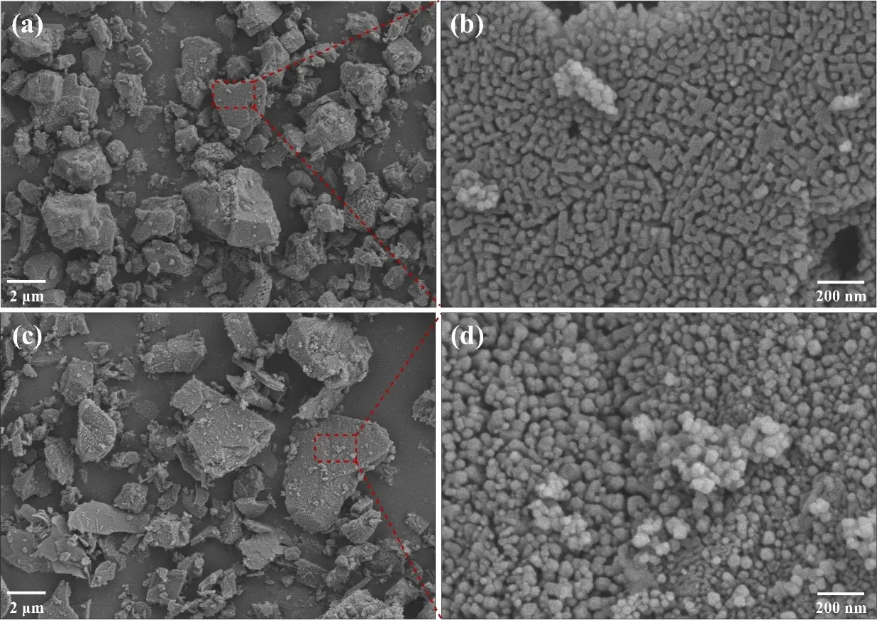 . Microstructure of calcined Tibetan microcrystalline magnesite and Liaoning crystalline magnesite at 1000 °C: (<b>a</b>,<b>b</b>) Tibetan microcrystalline magnesite, (<b>c</b>,<b>d</b>) Liaoning crystalline magnesite.