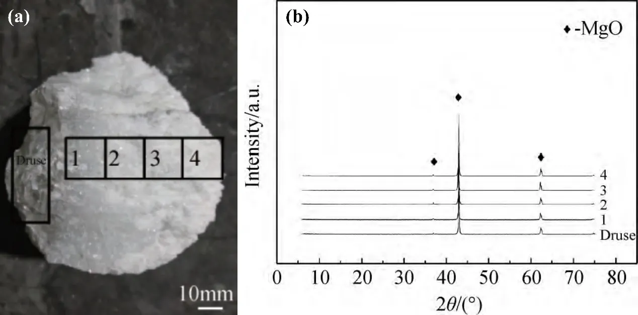 . Macro-morphology and XRD analysis of fused magnesia prepared based on Tibetan microcrystalline magnesite: (<b>a</b>) fused magnesia, (<b>b</b>) XRD patterns of each region of fused magnesia.