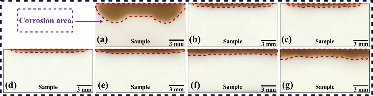 . The macroscopic diagrams of cement clinker corrosion interface for sintered magnesia with different ZnO dosages: (<b>a</b>) 0 mol%, (<b>b</b>) 1 mol%, (<b>c</b>) 2 mol%, (<b>d</b>) 4 mol%, (<b>e</b>) 6 mol%, (<b>f</b>) 8 mol%, and (<b>g</b>) 10 mol%.