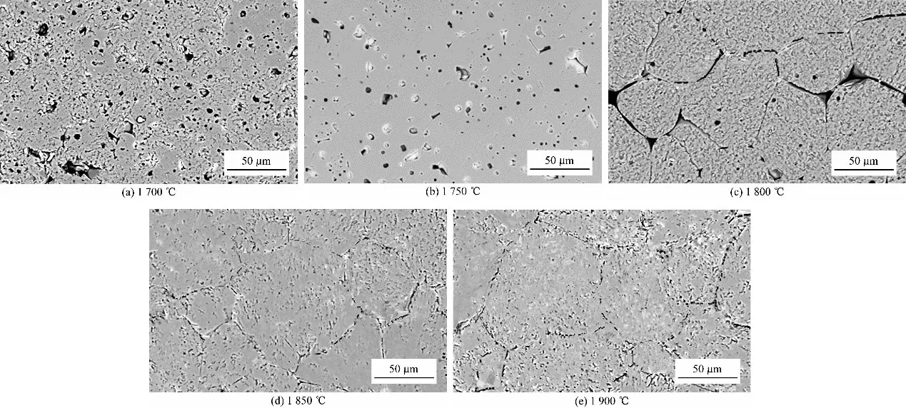 3). shows the SEM plots of the sintered magnesia obtained by holding the temperature for 3h at different secondary calcination temperatures. Combined with , it can be seen that with the increase of sintering temperature, the sintering mechanism changes from volume diffusion to grain boundary diffusion, the activation energy decreases, and the pores migrate along the grain boundaries and are discharged, which improves the densification of the sintered magnesia.