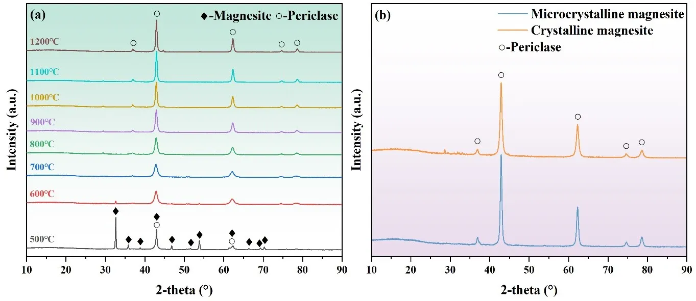 . XRD patterns: (<b>a</b>) Tibetan microcrystalline magnesite after calcination at different temperatures, (<b>b</b>) Tibetan microcrystalline magnesite and Liaoning crystalline magnesite after calcination at 1000 °C.