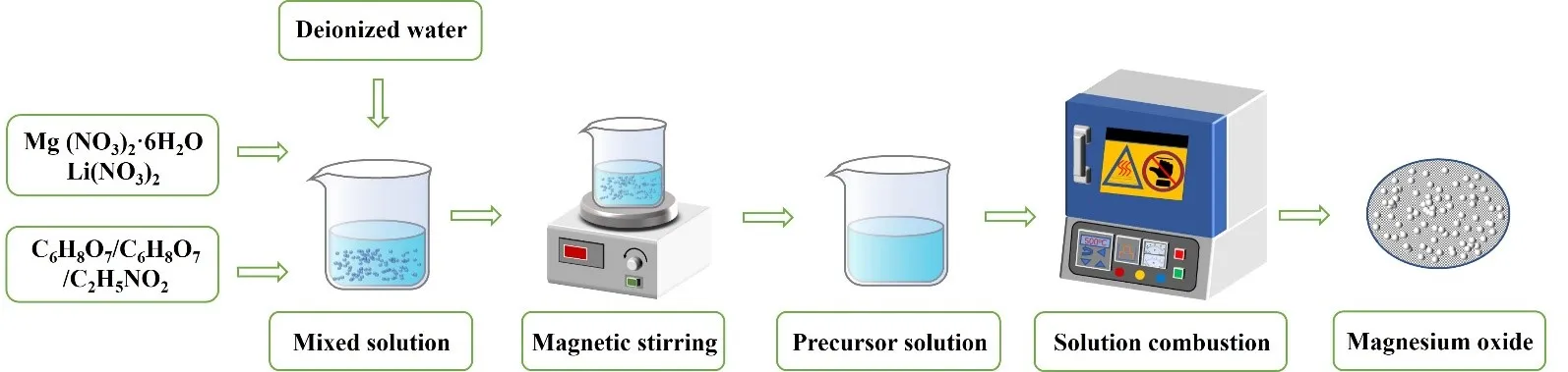 49] prepared magnesium nitrate hexahydrate by hydrolytic leaching and solution combustion using Tibetan microcrystalline magnesite as raw material and further synthesized magnesium oxide nanoparticles with different morphologies and particle sizes by solution combustion and microwave-assisted solution combustion. and show the process flow diagrams for the preparation of magnesium nitrate hexahydrate based on Tibetan microcrystalline magnesite and Li ion-doped Nano-magnesium oxide based on the solution combustion method, respectively.