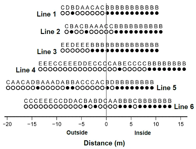 Six transect lines (Lines 1 to 6) were established in 2016 in an area mined in 1972 (), marked by plastic stakes installed at 2-m intervals. The lines were separated more than 20 m apart. The lengths of lines were 20 m for Lines 1–3 and 30 m for Lines 4–6. The lines traversed the boundaries of