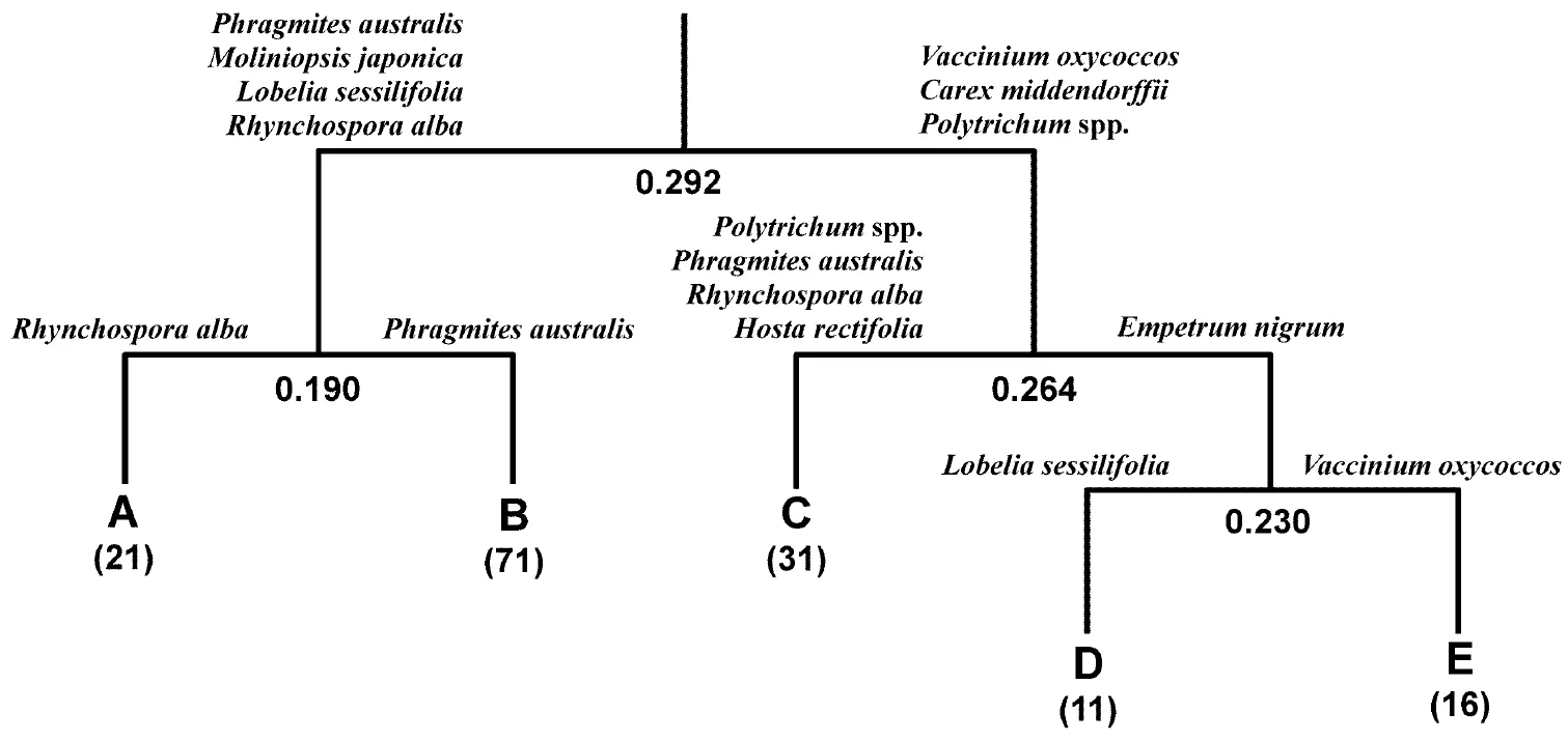 J’) between vegetation types classified by TWINSPAN, with the assumptions of gaussian distribution for the distance and