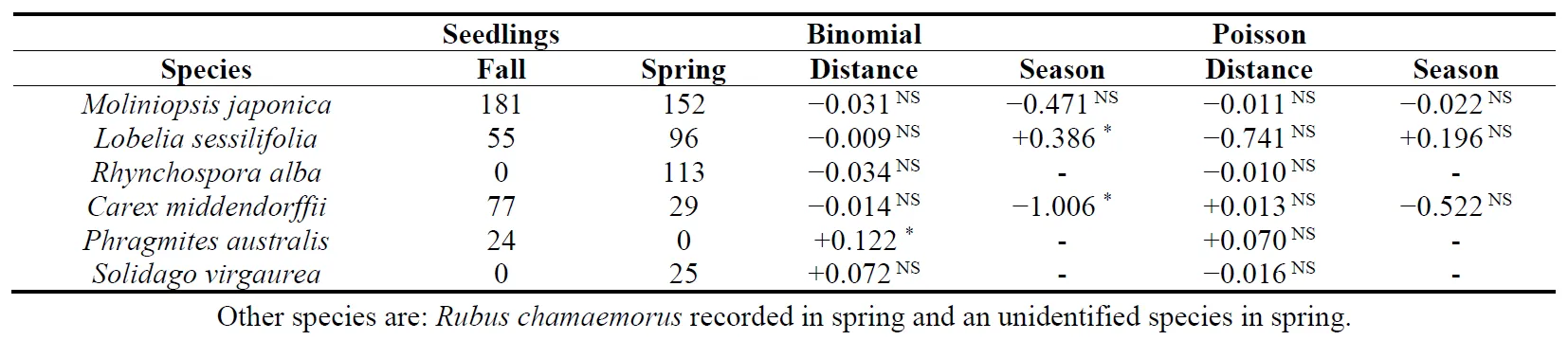 Field observations confirmed that most species completed their seed dispersal before seed bank sampling in the fall of 2016. Thus, the seed bank samples in the fall contained seeds dispersed in 2016. Sampling in the spring of 2017 was conducted before shoot emergence for most species, ensuring that the samples did not contain seeds produced in 2017.