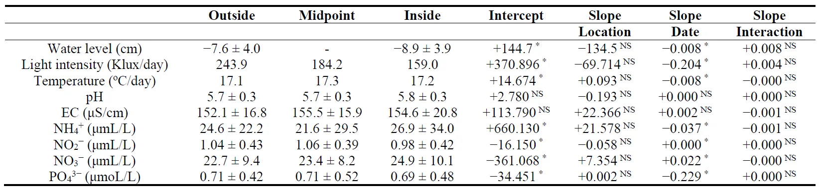 43−) were examined among the outside, midpoint and inside locations and among dates by GLMMs with the assumption of gaussian distribution and the interaction between distance and date. The significance levels were set to