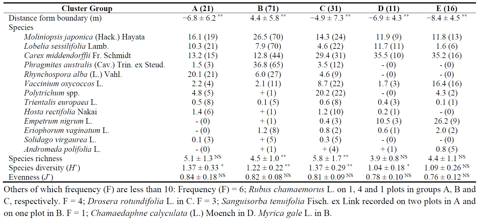 P. australis is the least prevalent and does not form grasslands on natural bogs adjacent to the post-mined peatland of Sarobetsu mire [