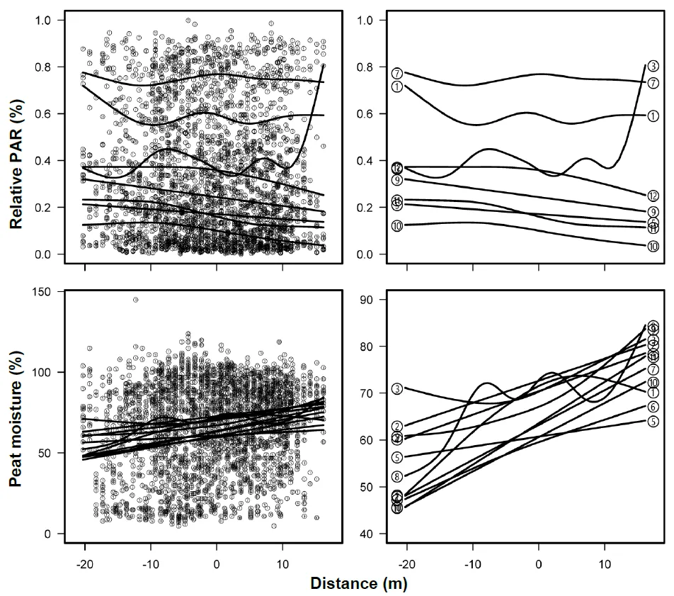 Daily cumulative light intensity and mean temperature were calculated based on data collected during 2016 and 2017. Differences in light intensities and temperatures among the locations and dates were compared by GLMMs, assuming gaussian distribution, with line code as a random factor. Peat moisture at different distances from the boundary was compared by GLMMs with the assumption of gaussian distribution. Differences in water level, light intensity, temperature and water chemistry (pH, EC, NH