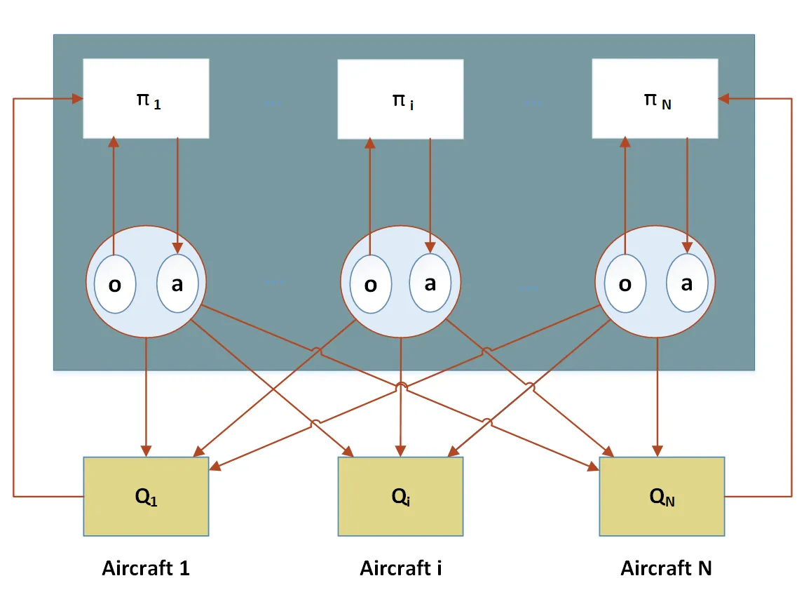 Qi is learned independently, allowing the reward for each aircraft to be designed independently. Each element in the experience replay buffer