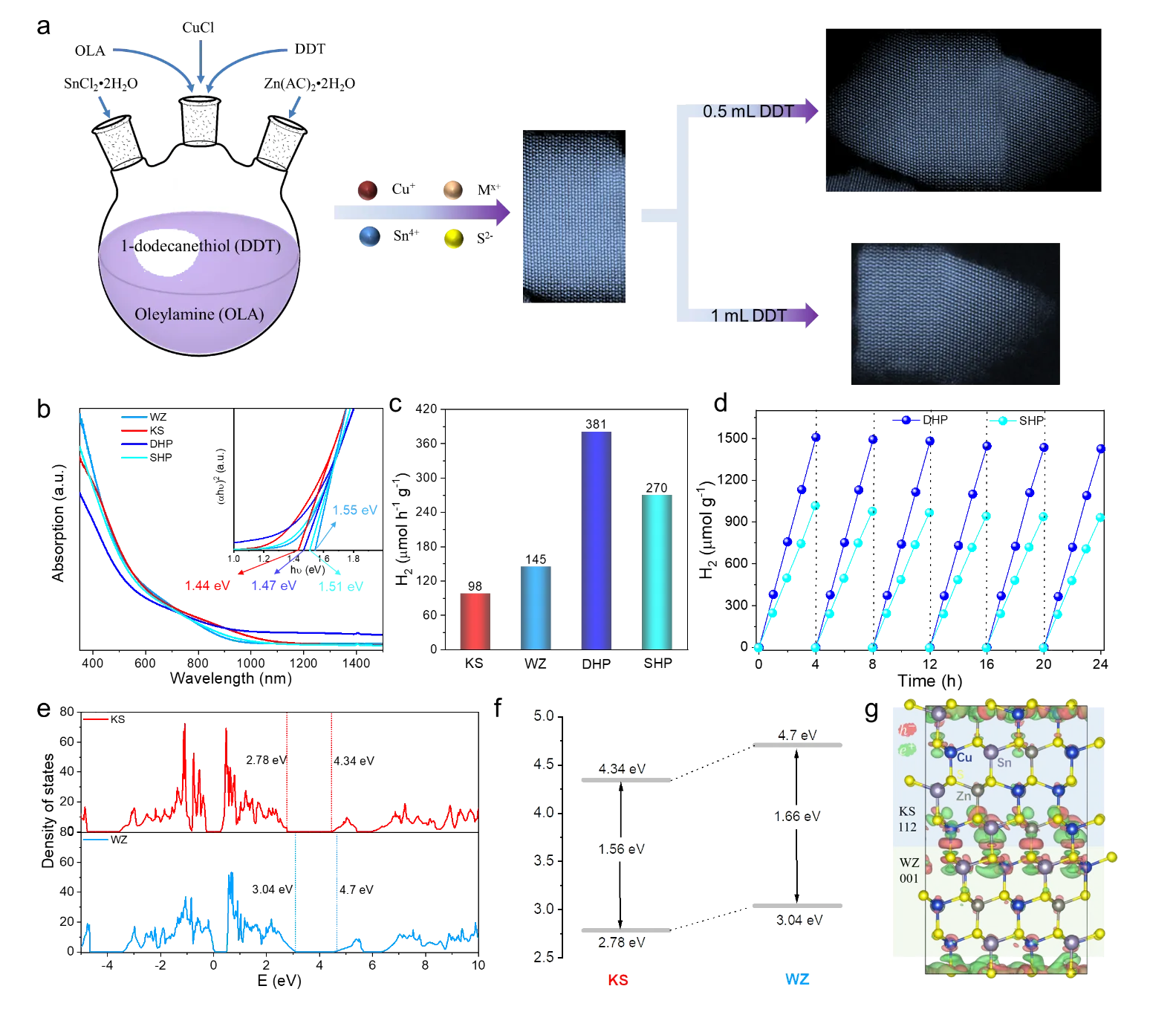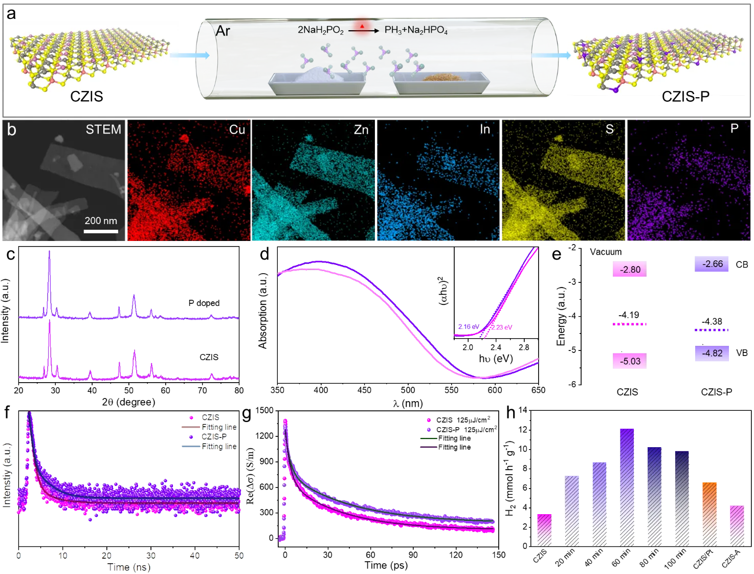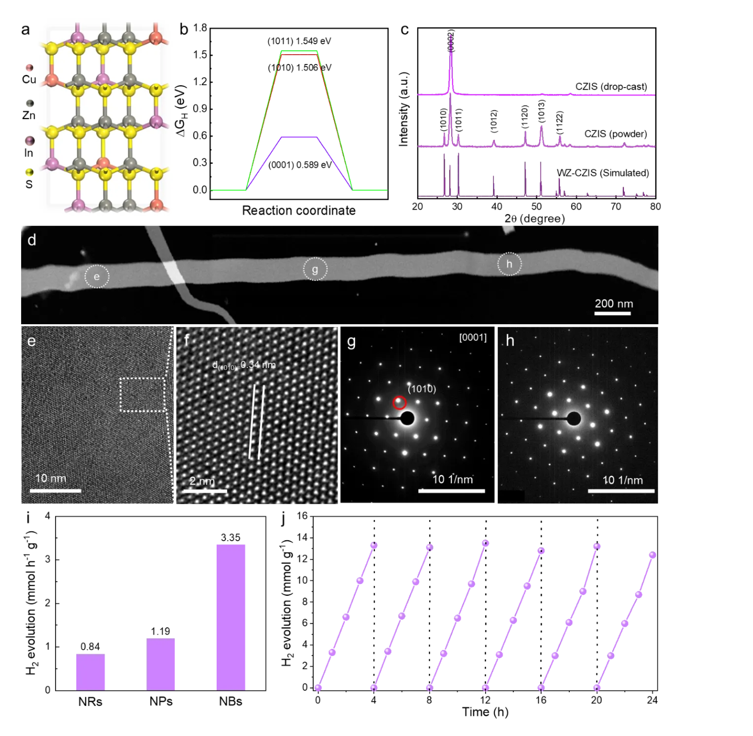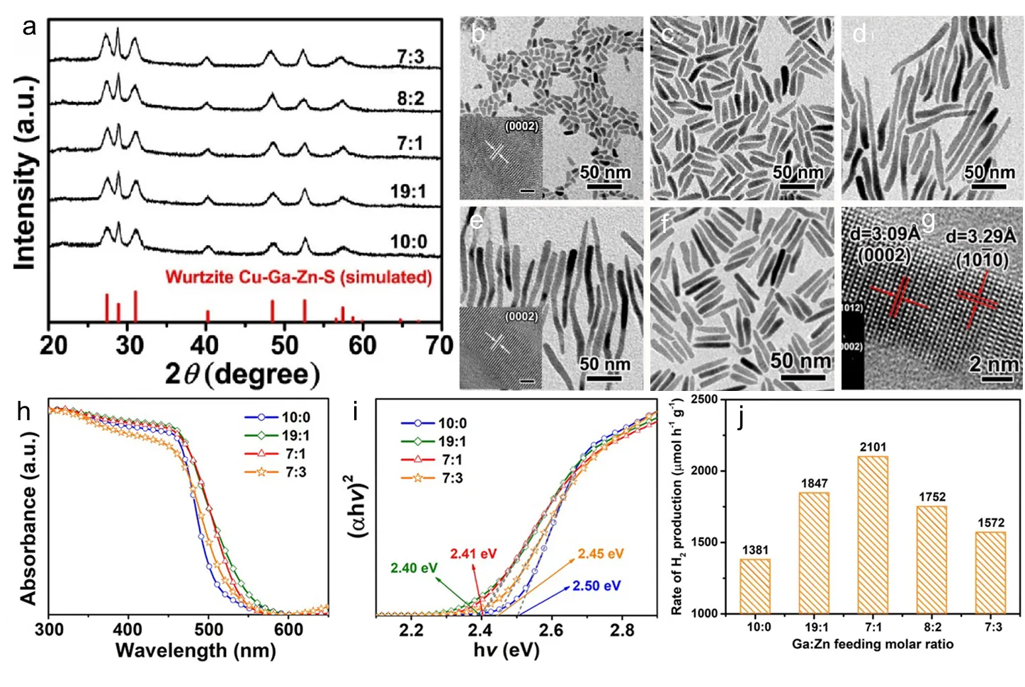 51]. As shown in a, the synthesized CZGS nanorods have a wurtzite (WZ) crystal structure, which remains unaffected by the Ga:Zn feeding molar ratio. The incorporation of Zn facilitated the growth of quaternary Cu−Ga−Zn−S nanorods along the [0001] direction. It promoted the formation of elongated nanostructures while preserving their 1D-shaped morphology and wurtzite crystal phase. As a result, the presence of Zn cations increases the length of the obtained nanorods (b–f). g shows a high-resolution transmission electron microscopy (HRTEM) image of CZGS nanorods with a Ga:Zn feeding molar ratio of 7:1. There are two series of vertical lattice fringes with spacings of 3.09 and 3.29 Å, corresponding to the (0002) and (10-10) planes of WZ CZGS. The alteration of optical properties in CZGS nanorods induced by composition was further characterized via absorption spectroscopy. The absorption band edge exhibits a noticeable blue shift (h), while the bandgap increases (i) with an increasing Ga:Zn feeding molar ratio, respectively. The photocatalytic hydrogen production performances of CZGS nanorods can be effectively regulated by adjusting the Ga:Zn feeding molar ratio. The CZGS nanorods with a Ga:Zn feeding molar ratio of 7:1 exhibit the best photocatalytic performances with a hydrogen evolution rate of 2.101 mmol h