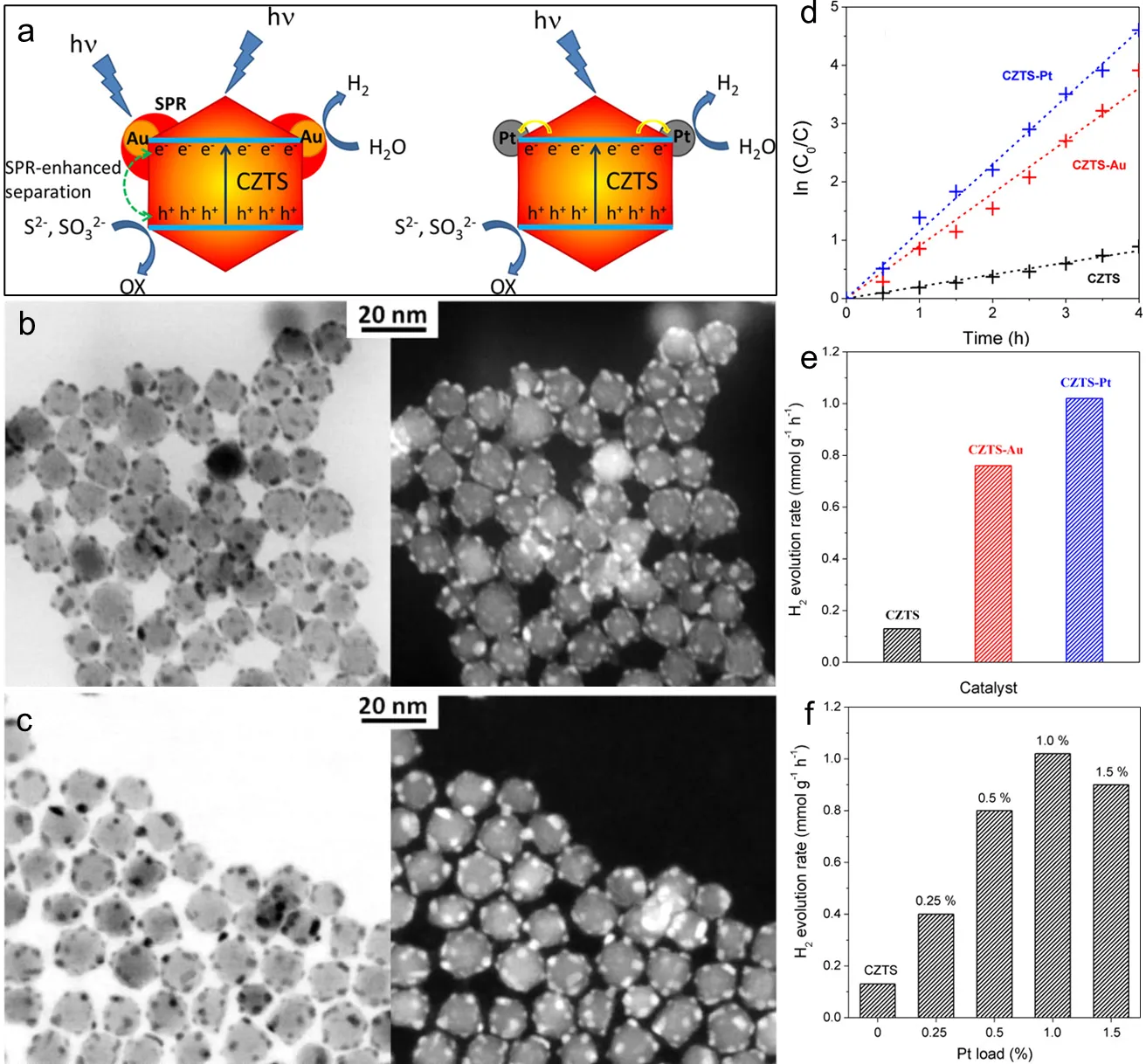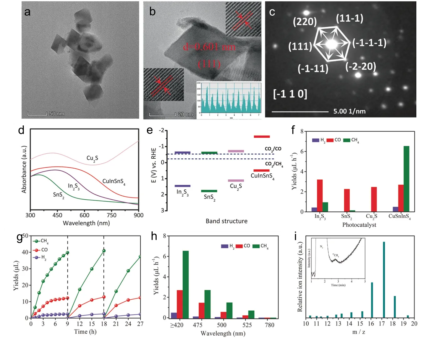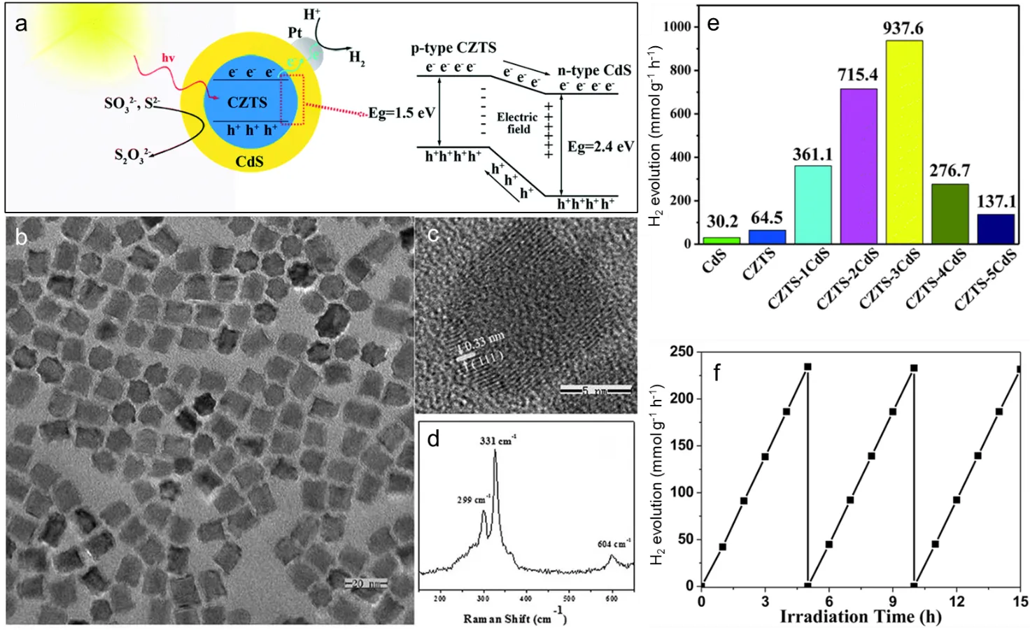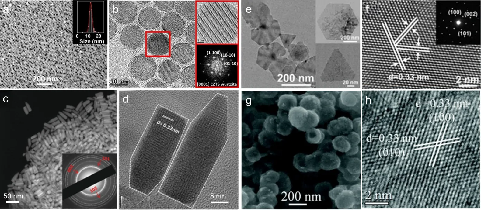 68]. The obtained thin CZTS nanosheets exhibited predominantly quasi-triangular and hexagonal morphologies, with an average size ranging from 300 to 400 nm (e). The HRTEM image revealed lattice fringes exhibiting an interplanar spacing of 0.33 nm, corresponding to the (100) family planes of WZ CZTS (f). The selected area electron diffraction (SAED) pattern (inset of f), combined with the HRTEM image, indicates that the WZ CZTS nanosheets expose the high-energy (002) plane and exhibit a well-crystallized, single-crystalline nature. 3D nanostructures have also been synthesized to improve the photocatalytic activity of semiconductor photocatalysts, as these nanoscale assemblies can serve as active sites for photocatalytic reactions [