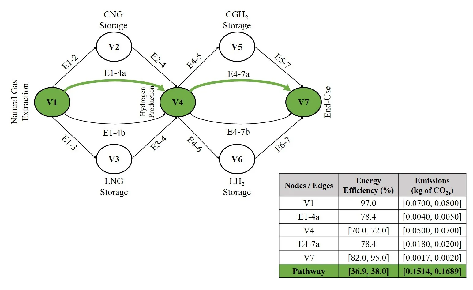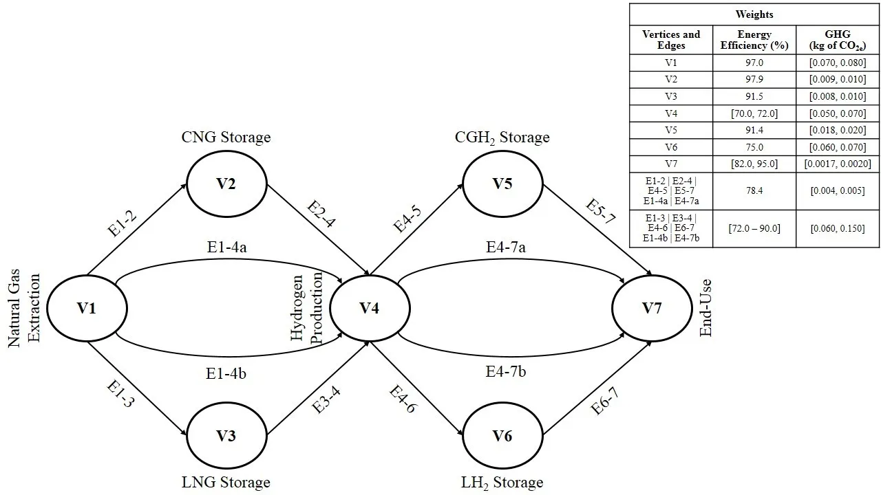 The current research uses the bi-objective Dijkstra Algorithm, adapted to handle the dual objectives of energy efficiency and GHG emissions in the grey-blue hydrogen supply chain. This single-source-sink algorithm calculates the optimal path from one starting point (the extraction site) to one endpoint (the final application site).