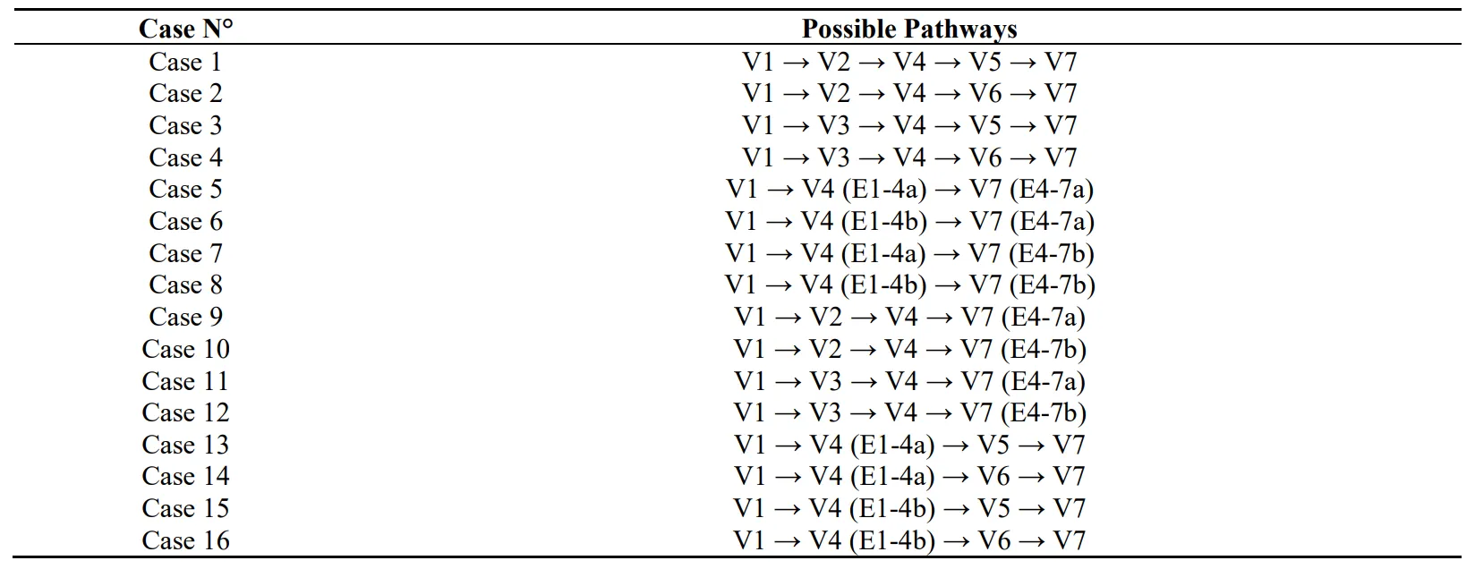 u, a new distance is calculated as in (12). The Breve symbol above efficiencies is the complement, where it should be subtracted from the source efficiency to compute final energy efficiency. The given equation for computing energy efficiency is an alternative to (1). For example, consider a scenario where the energy efficiency of the source vertex is 98%, the efficiency of the subsequent vertex in the queue is 90%, and the efficiency of the connecting edge is 80%. The complement, or inefficiency, of the next vertex is 10%, and the inefficiency of the connecting edge is 20%. This results in a total energy efficiency drop of 30% from the source vertex, leading to an overall efficiency of 68%. In contrast, the calculation of GHG emissions is additive, where emissions from the source, vertices, and edges accumulate along the path, contributing to the total emissions without any reductions. Then, for all