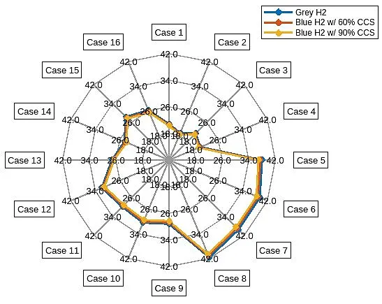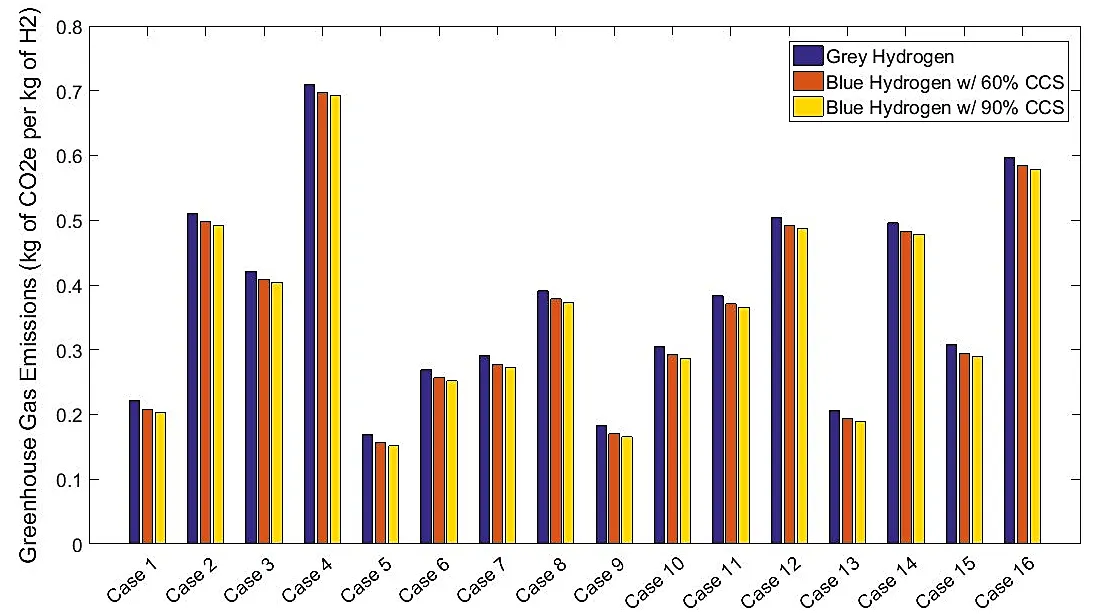2e per kg of hydrogen. The lowest emissions are observed in Case 5 for blue hydrogen with 90% CCS, highlighting the effectiveness of higher levels of carbon capture. In contrast, the highest emissions occur in Case 4 within the grey hydrogen supply chain.