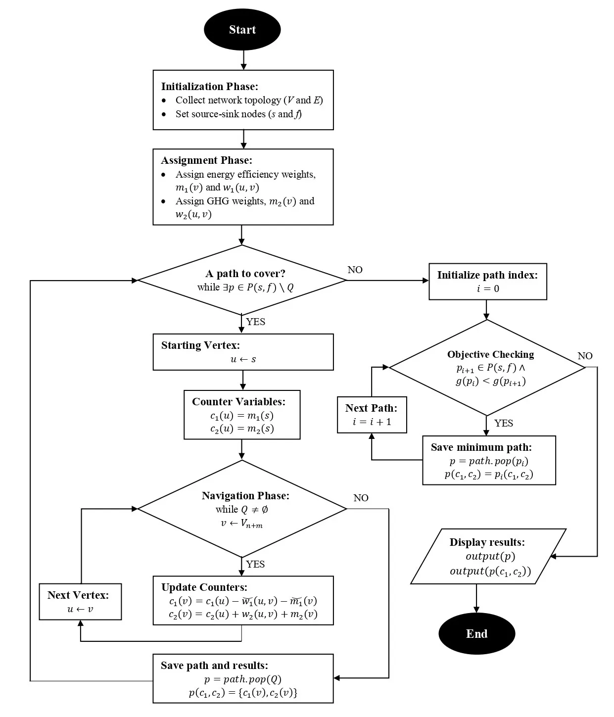 . Algorithm Flowchart of Energy-Emissions-Efficient Shortest Path.